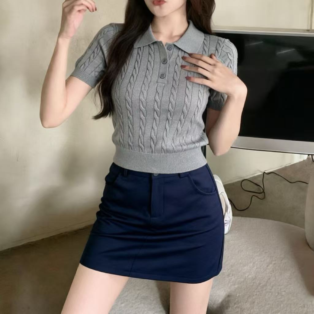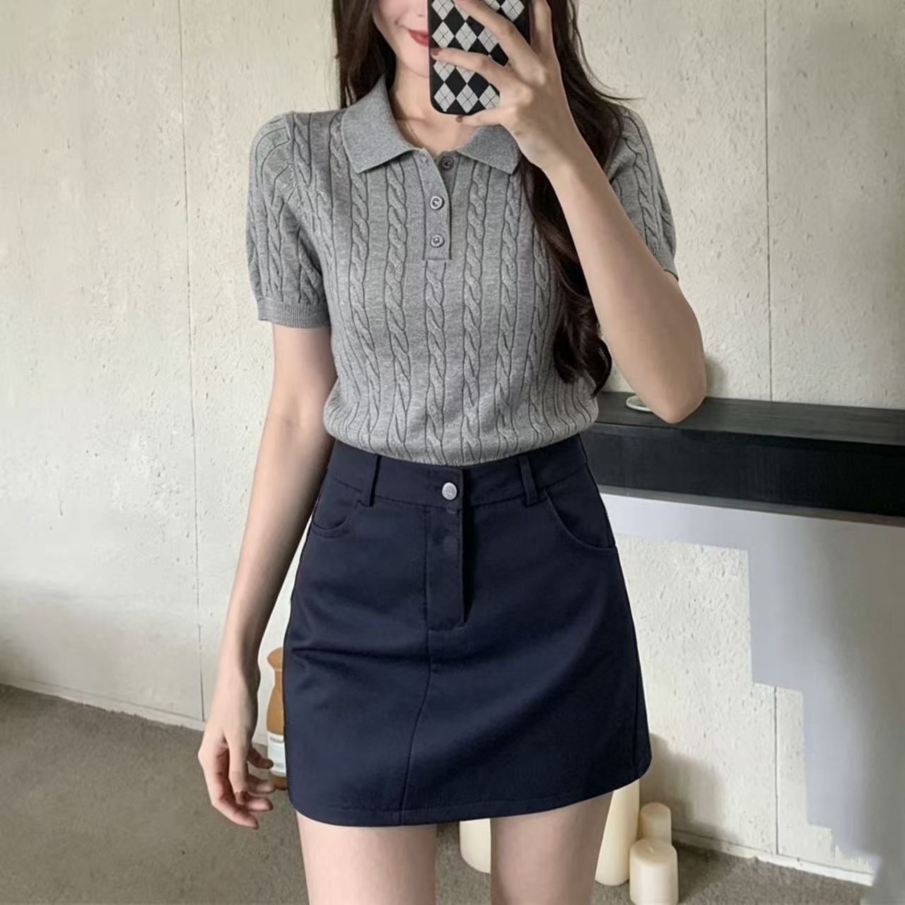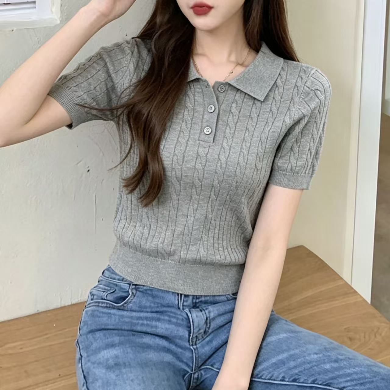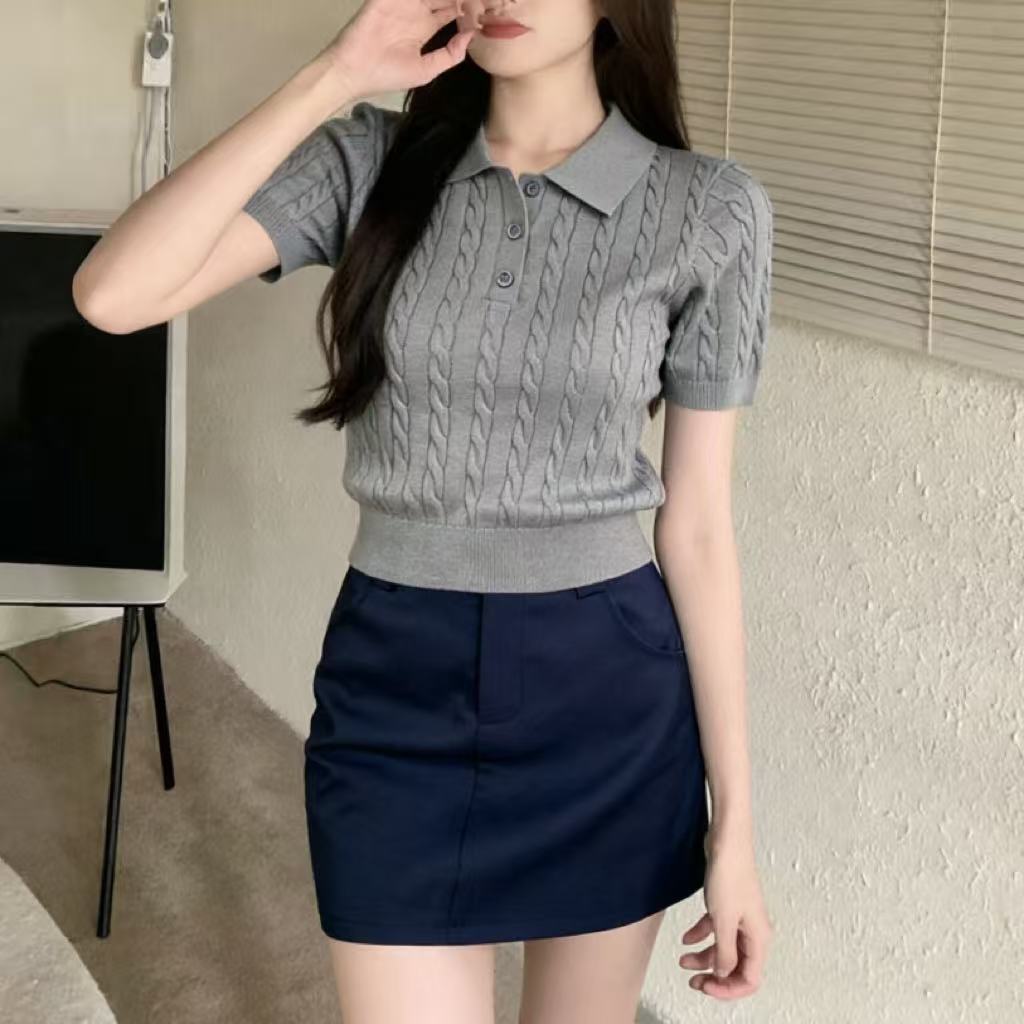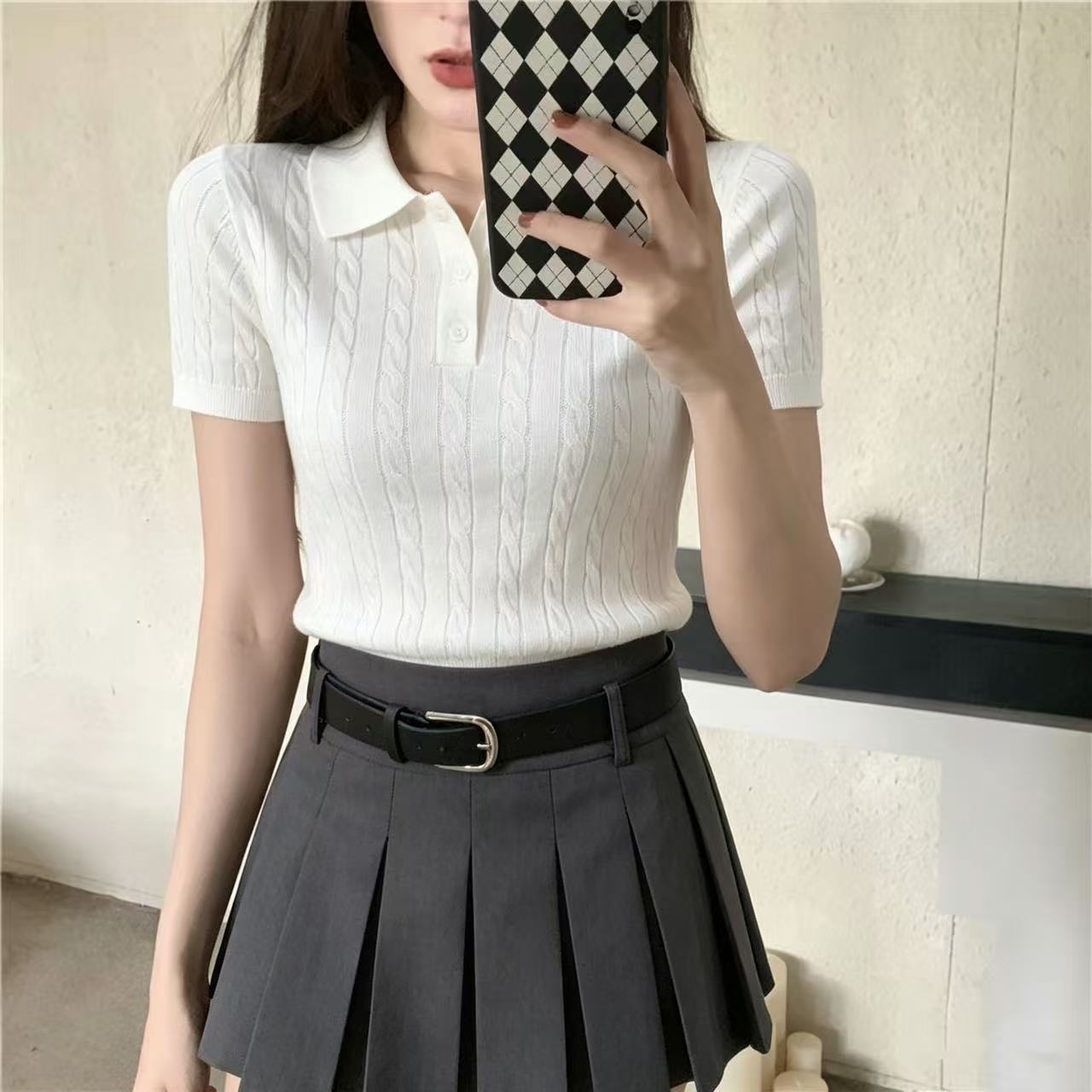 실사 정가 레트로 하프 칼라 Feifei 소매 니트 슬림해 보이는 기본 셔츠 반팔 니트 맨위