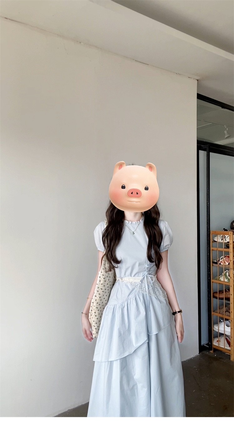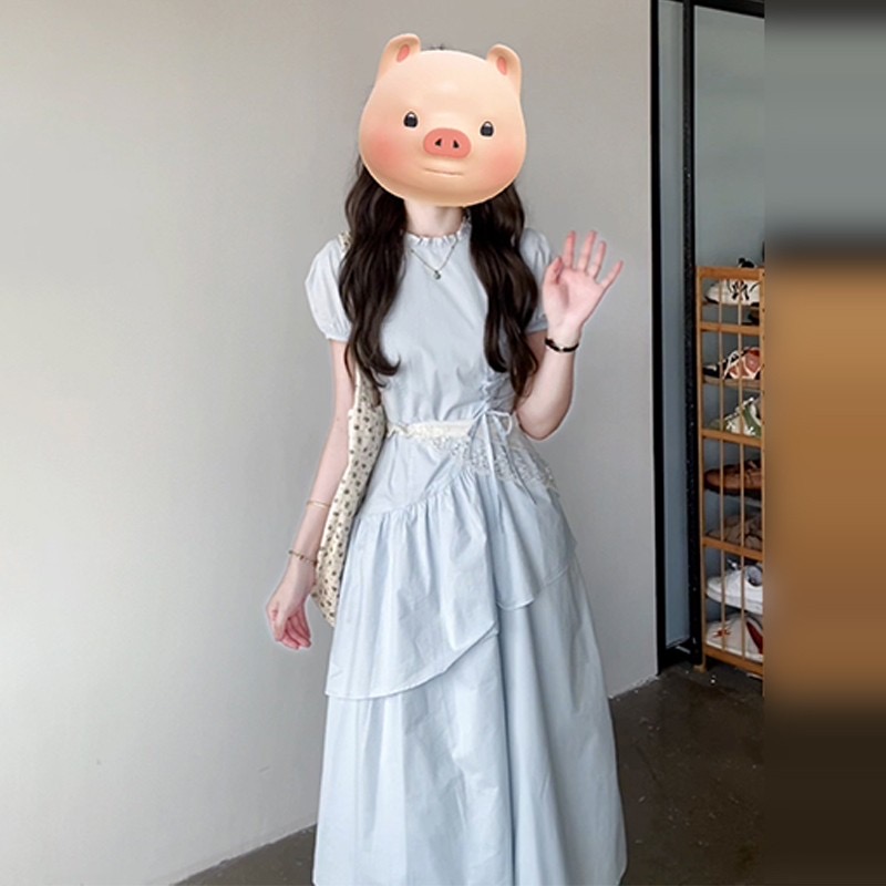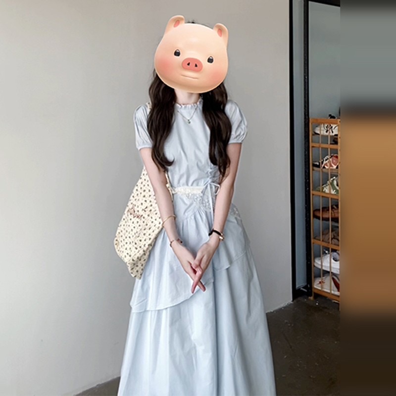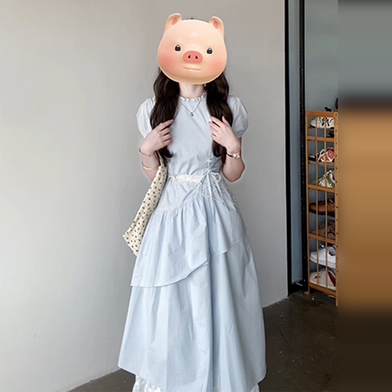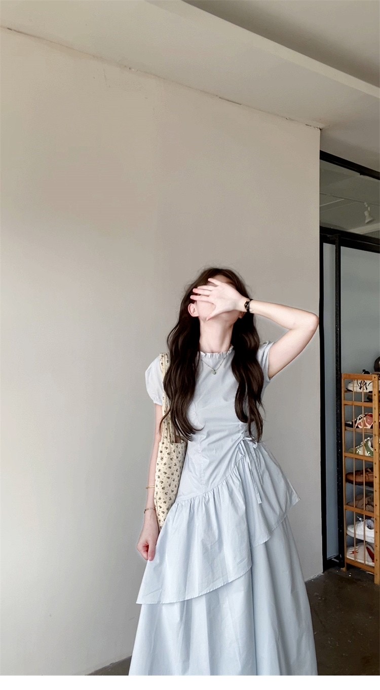여름 2026 새로운 프랑스식 부드러운 바람 파란색 반팔 드레스 아이들 작은 키 불규칙 품격 롱 스커트