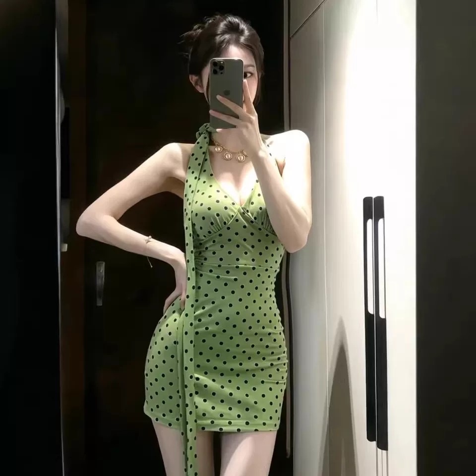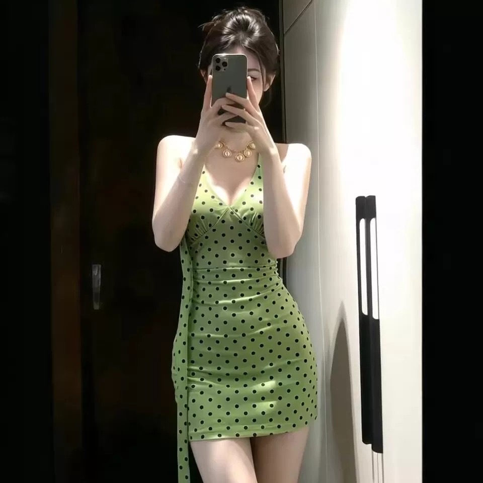 로얄 자매 섹시함 핫걸 착용 가져 가라. 녹색 도트 무늬 행침 목 드레스 특별 아름다운 꼬집기 허리 작은 치마 2026 여름