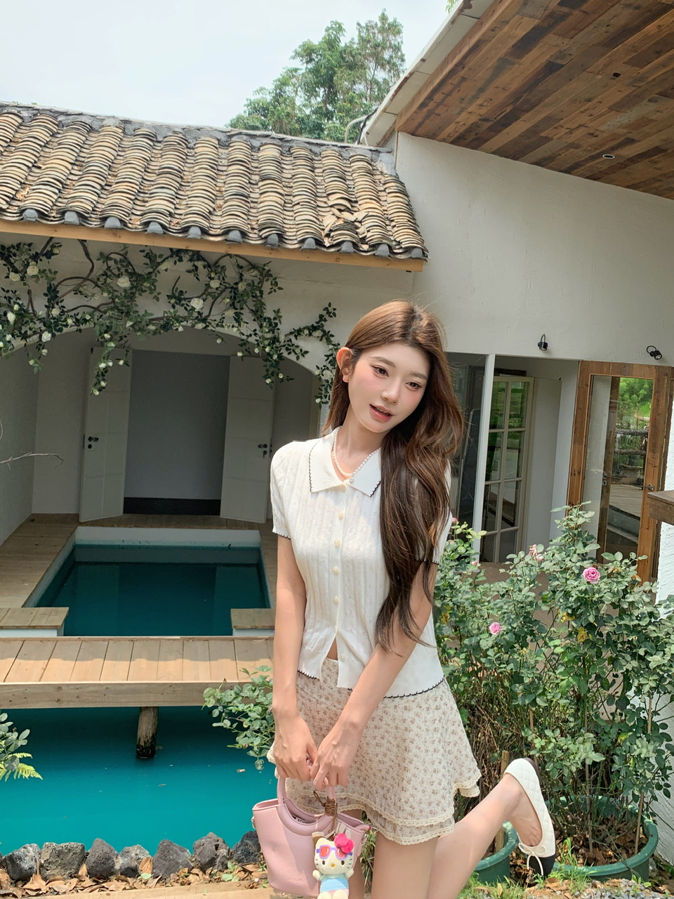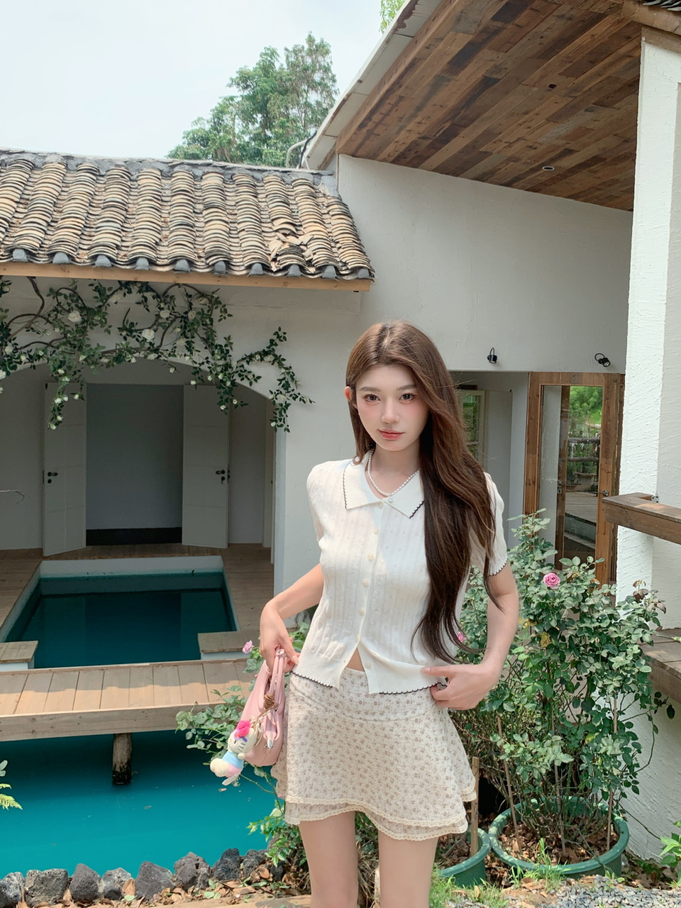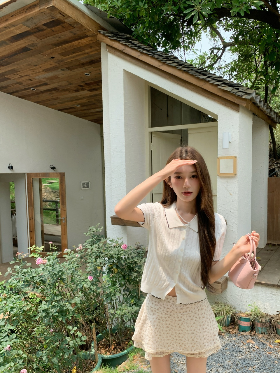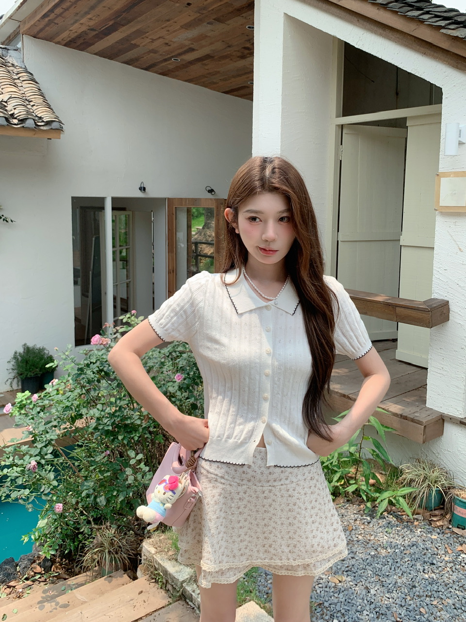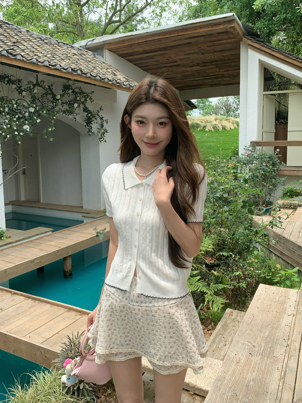 실사 여름 신선함 V넥 루즈핏 조끼 인형 셔츠 와이드 레그 팬츠 치마 임신 엄마 디스플레이 화이트 연령 감소 세트