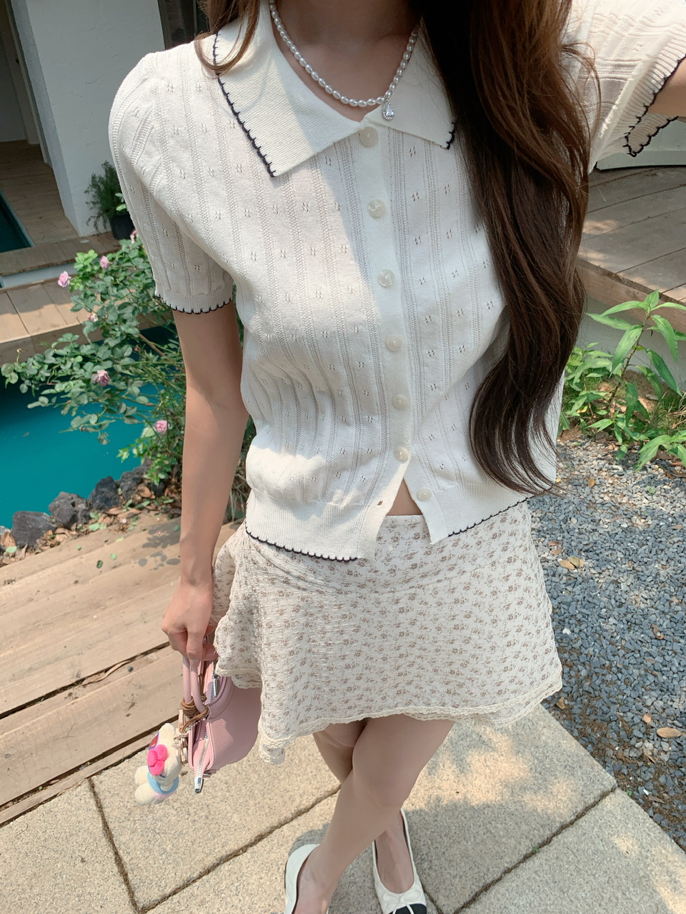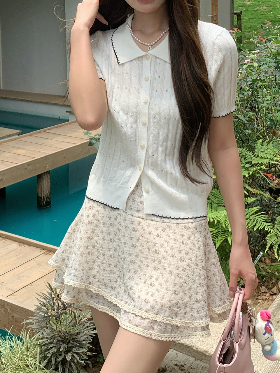 정가 실사 한 부서 부드러운 바람 베이비 칼라 니트 반팔 작은 키 꽃무늬 케이크 드레스 투피스 세트