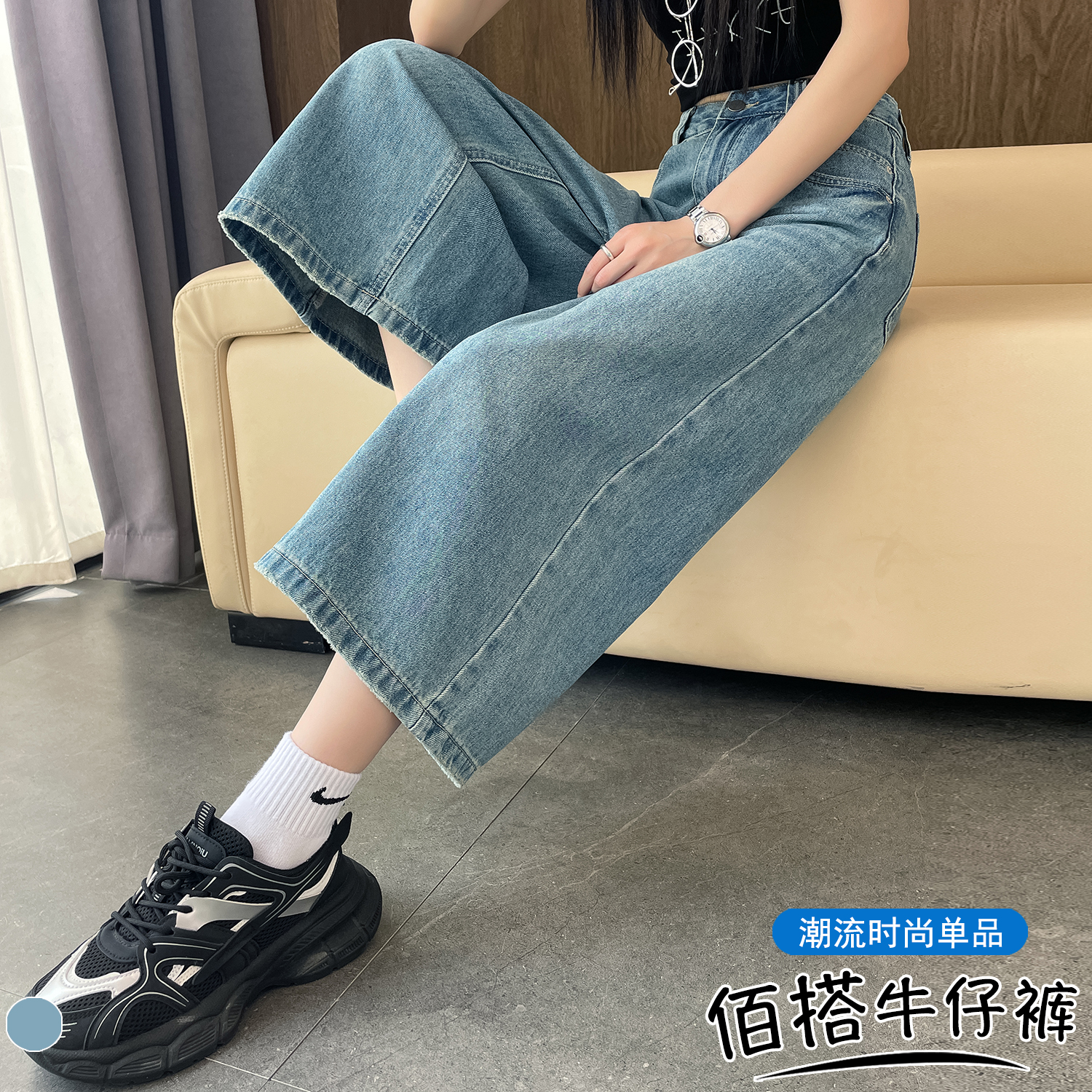 실사 디자인 센스 페이크 레이어드 주간 실크 데님 와이드 레깅스 바지 2026 봄 여름 하이웨이스트 슬림해 보이는 캐주얼 바닥 청소 바지