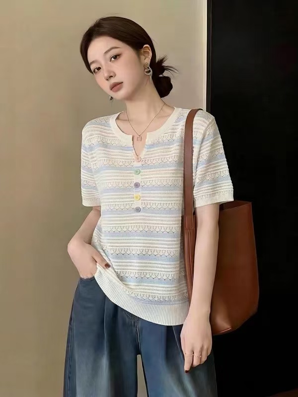 파란색 레이스 숄 니트 반팔 티셔츠 여성 봄 여름 새로운 부드러운 바람 품격 다용도 몸매 가꾸기 슬림해 보이는 맨위