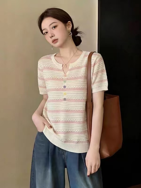 grow freely 핑크색 스트라이프 홀로우 아웃 니트 스웨터 반팔 여성 여름 얇은 스타일 슬림해 보이는 연령 감소 자수 맨위