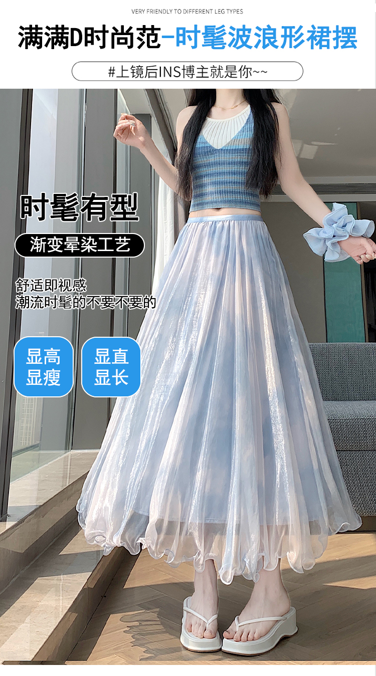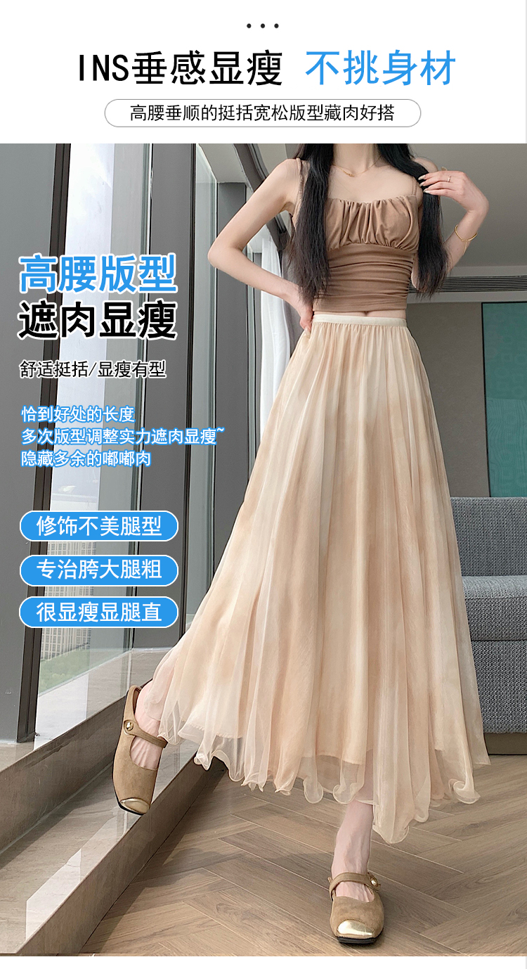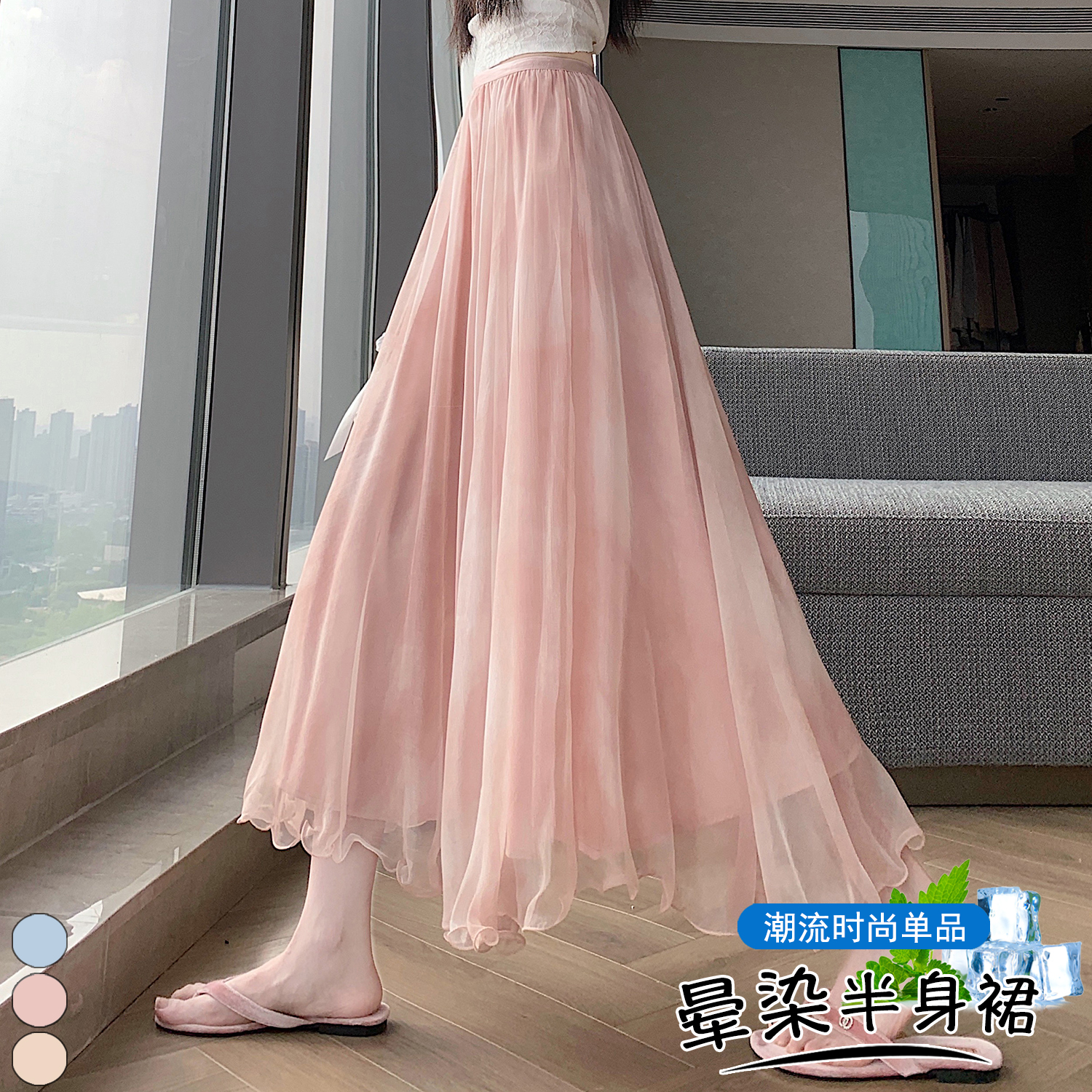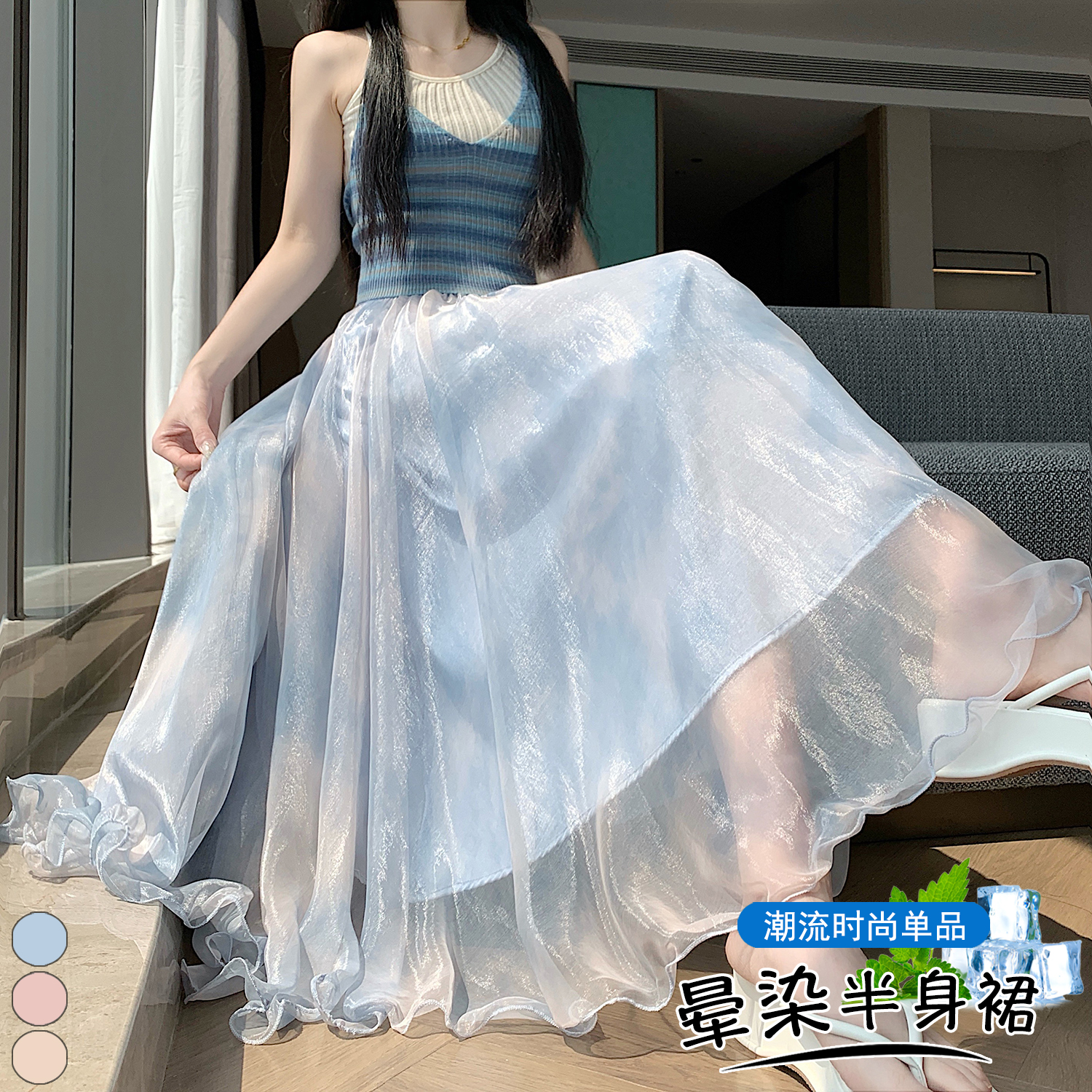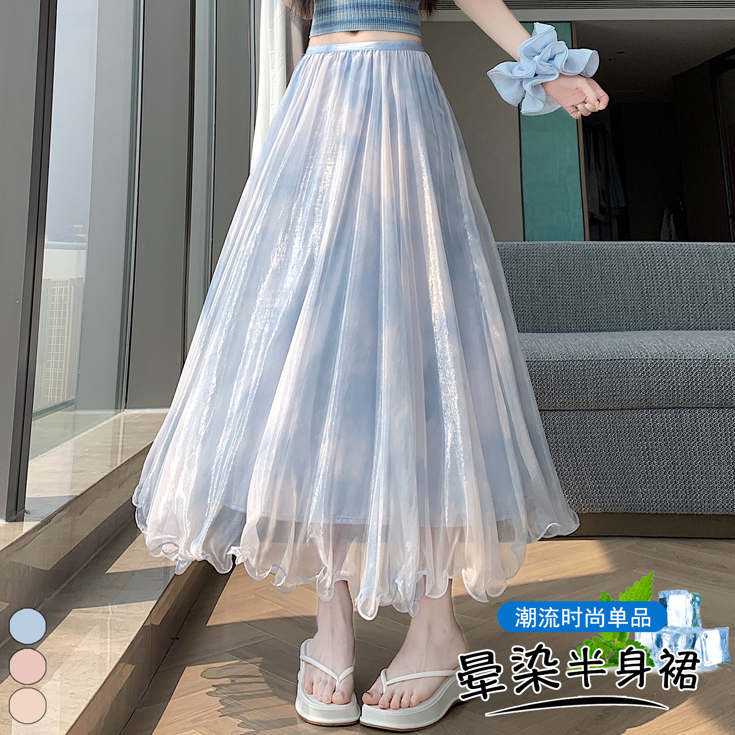 실사 프랑스식 헤일로 염색 깃발 실 롱 스커트 여성 여름 새로운 루즈핏 슬림해 보이는 반신 스커트 도루 가을 센스 플리츠 한 마디