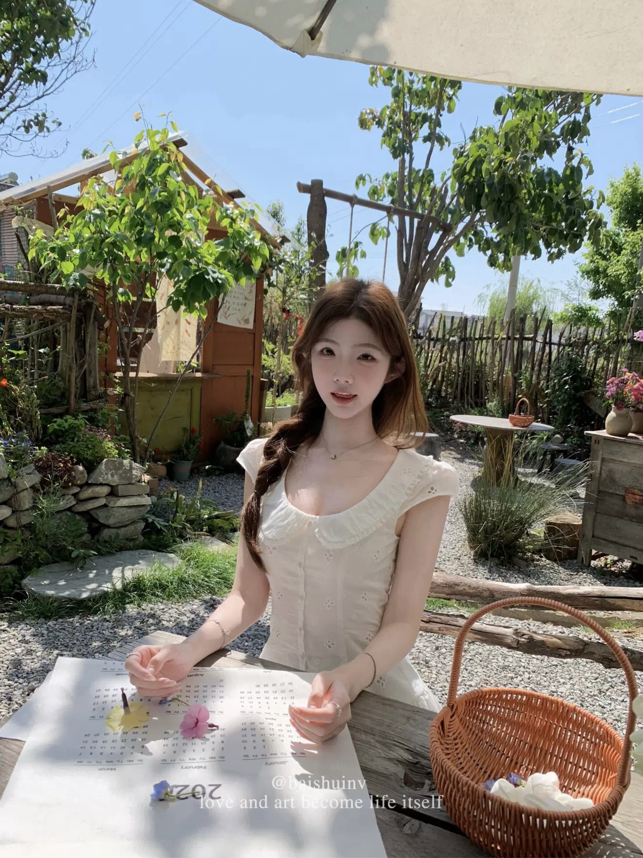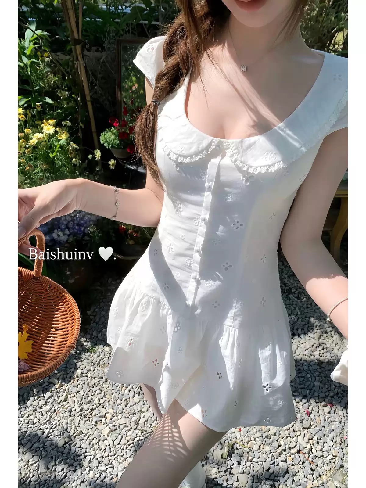 화이트 워터 여성 화이트 티 달콤한 꿈 베이비 칼라 자수 치마 여성 여름 달콤한 스타일 홀로우 아웃 통기성 슬림해 보이는 드레스