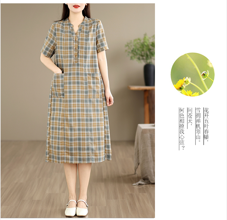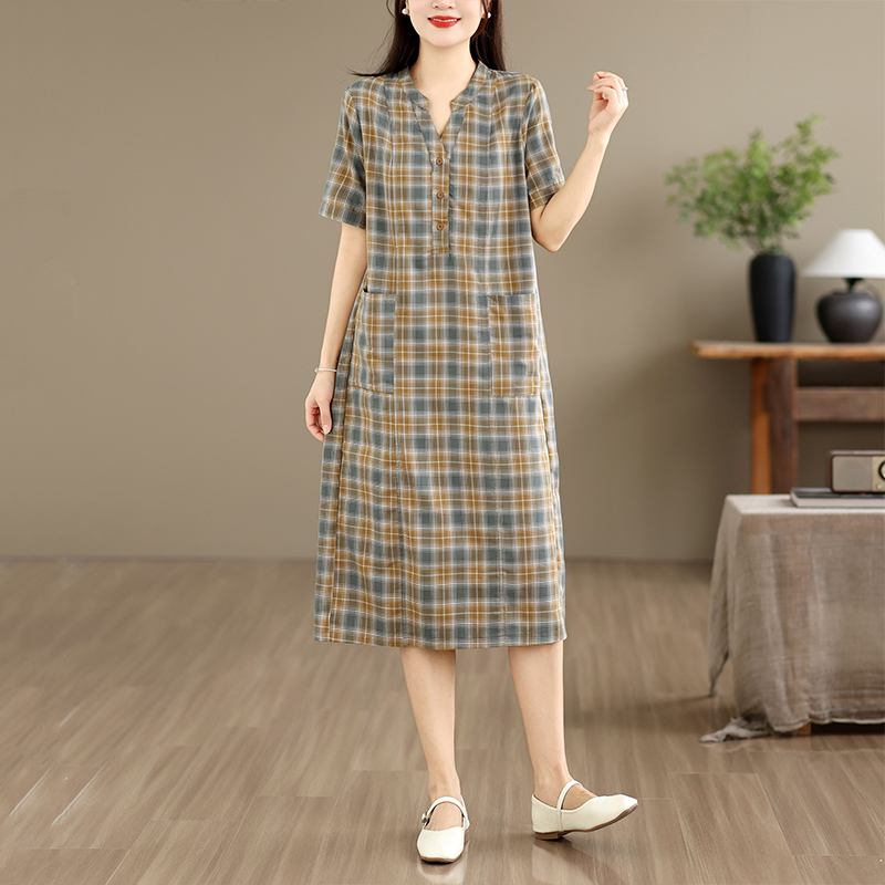 순면 품격 체크무늬 드레스 2026 여름 얇은 스타일 루즈핏 빅 사이즈 패션 V넥 외국 가스 엄마 치마