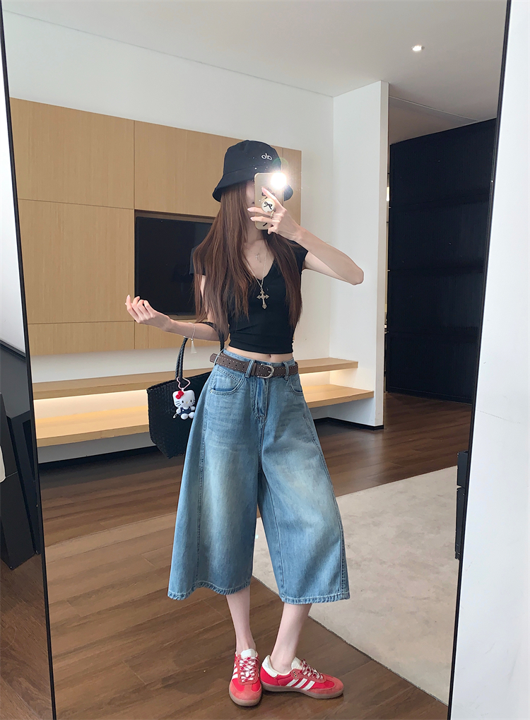 실사 아메리칸 레트로 워싱 5 점 청바지 여성 새로운 하이웨이스트 루즈핏 다용도 스트레이트 넓은 다리 바지