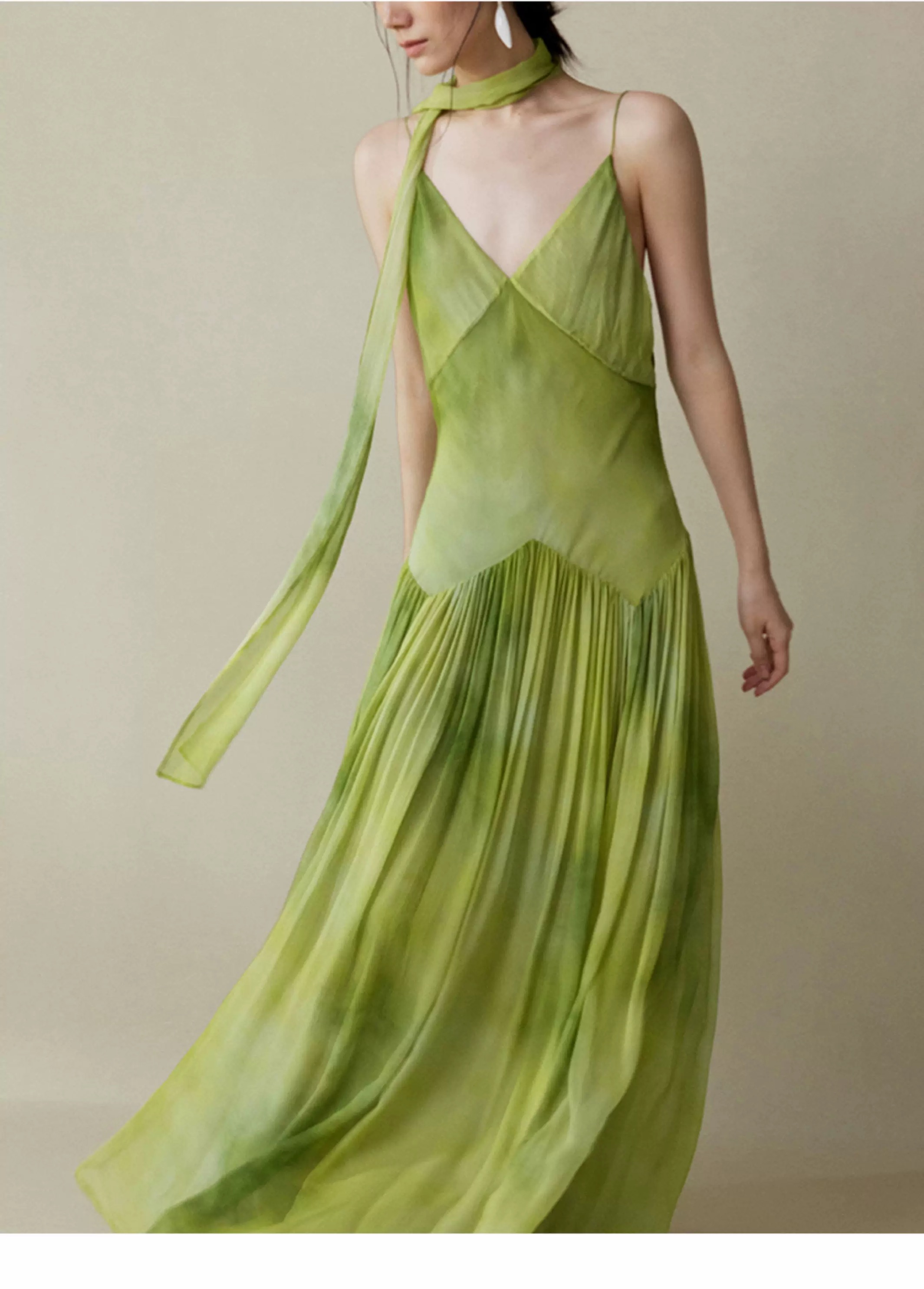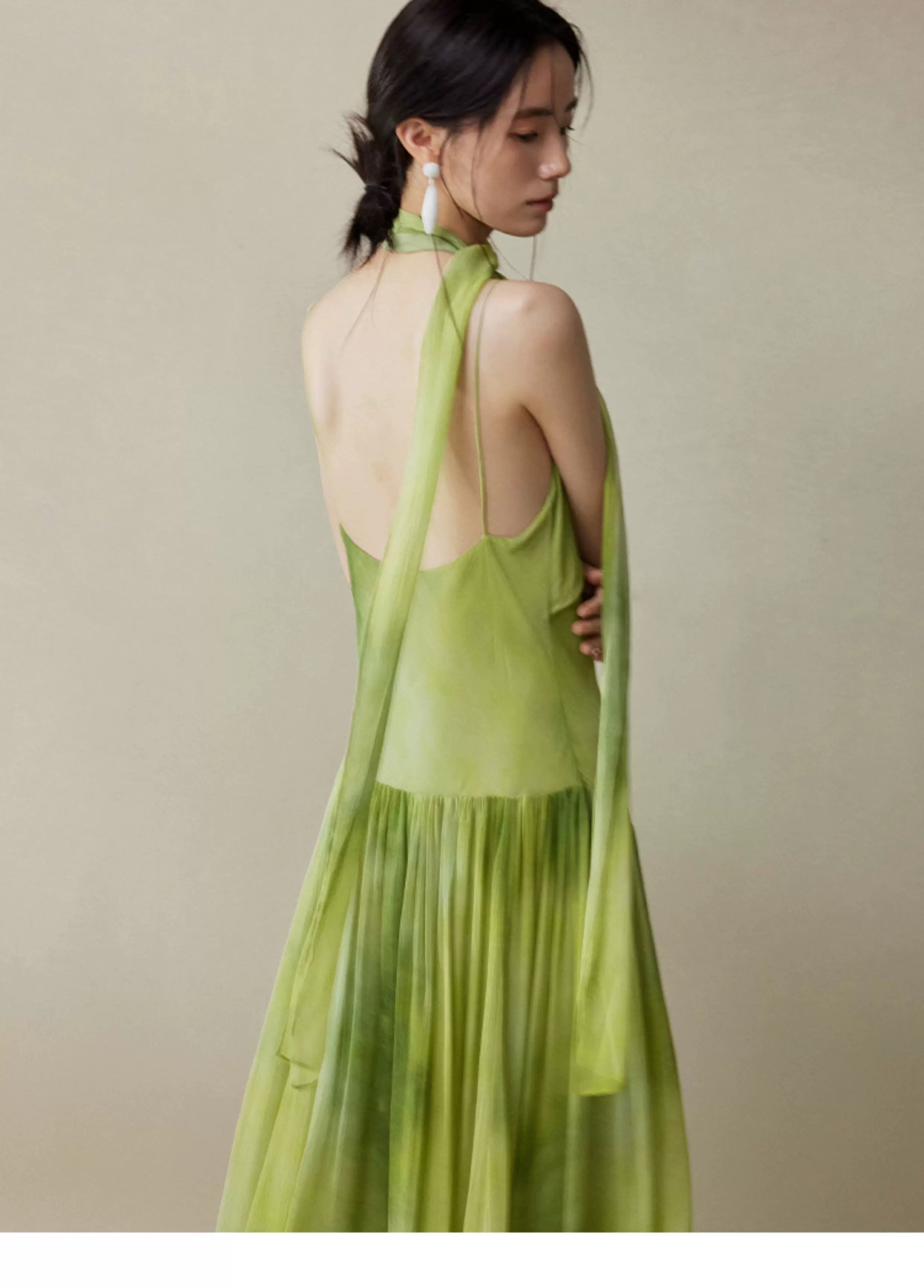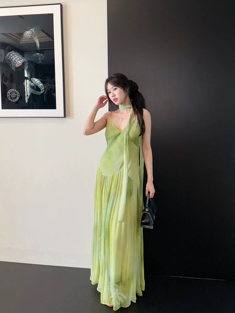 지금 재고 있음 여름 작은 대중 헤일로 염색 여성 드레스 녹색 허리 수축 슬립 드레스 휴가 고급 프린트 우아한 롱 스커트