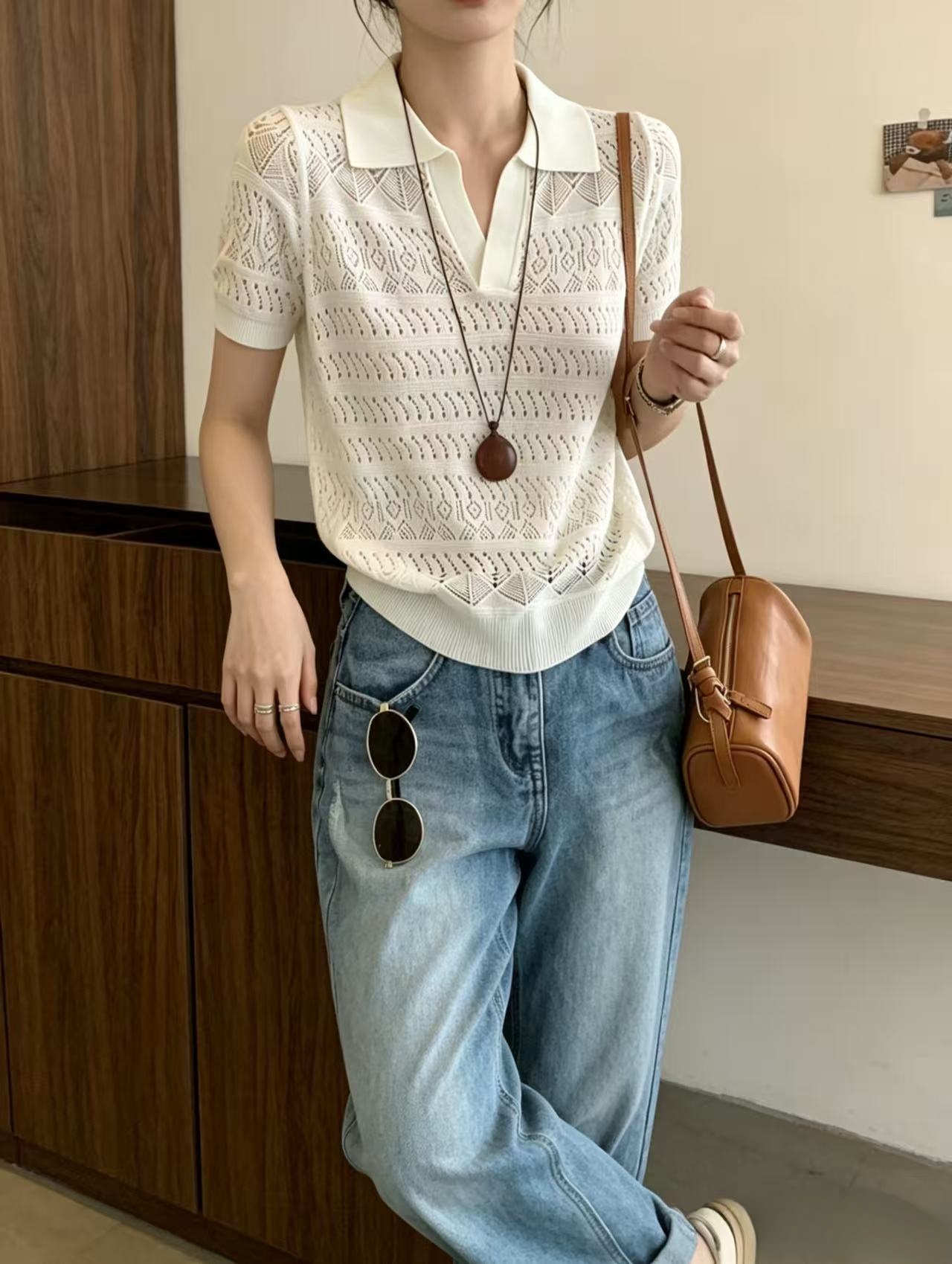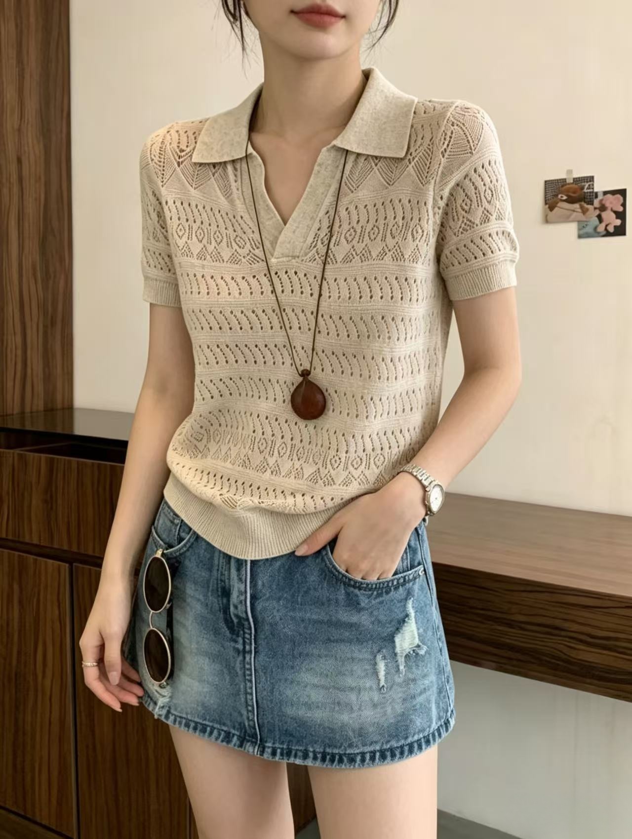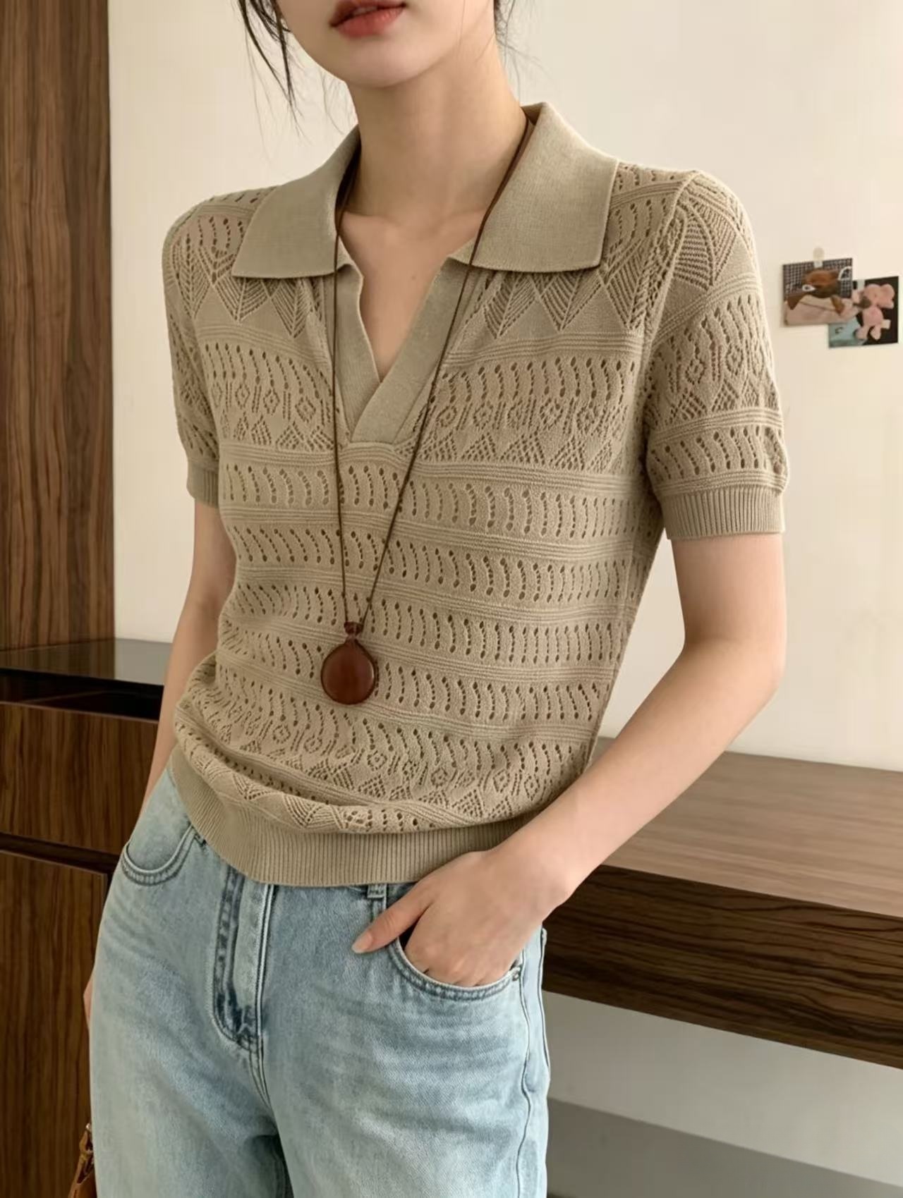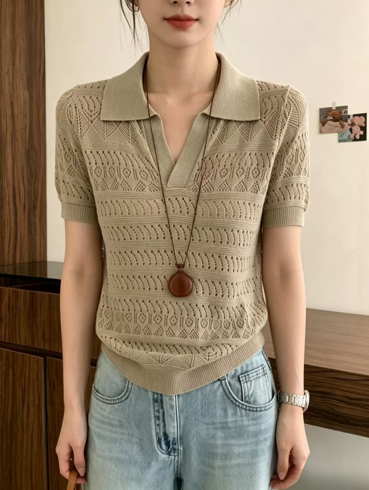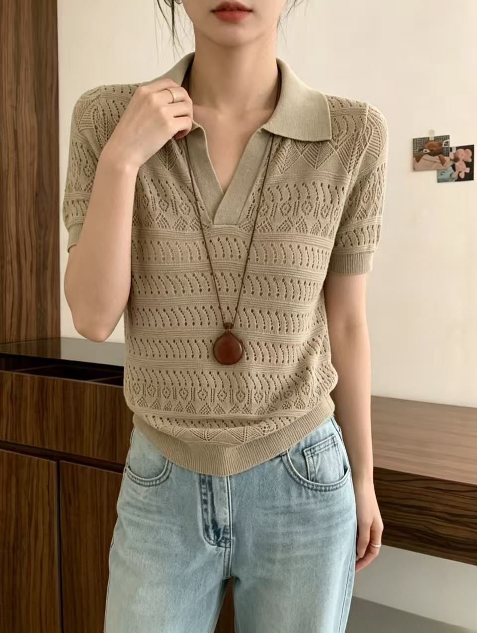 2026 여름 새로운 여성 의류 폴로 칼라 홀로우 아웃 니트 반팔 다용도 출퇴근 바람 루즈핏 슬림해 보이는 빅 사이즈 맨위 트렌디