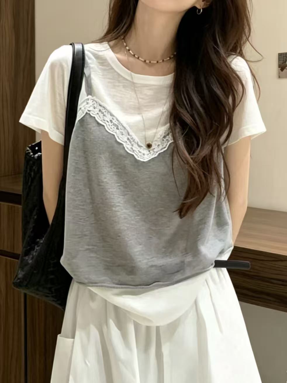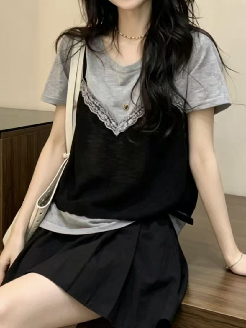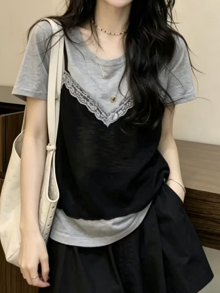 페이크 레이어드 레이스 외출용 조끼 디자인 센스 회색 반팔 티셔츠 여성 여름 새로운 한 부서 Chic 맨위