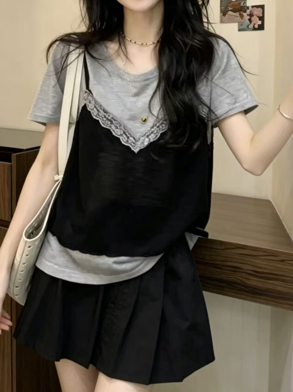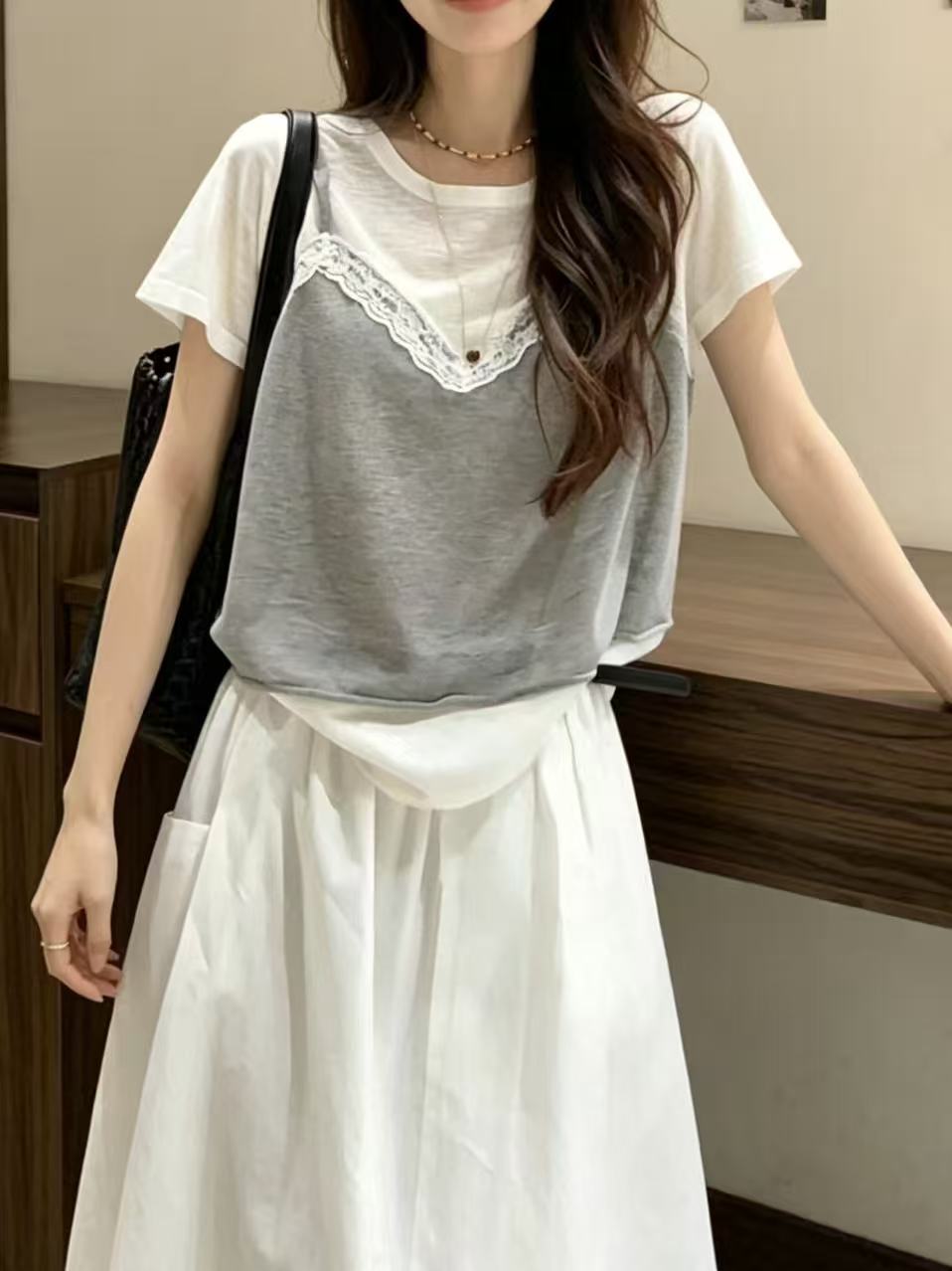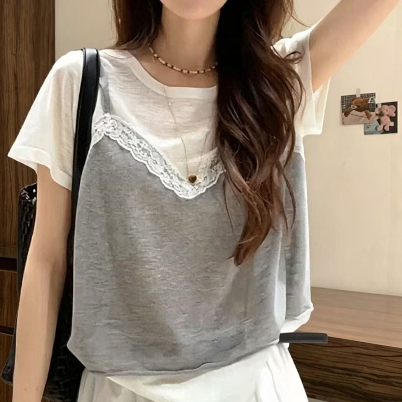 페이크 레이어드 레이스 외출용 조끼 디자인 센스 회색 반팔 티셔츠 여성 여름 새로운 한 부서 Chic 맨위