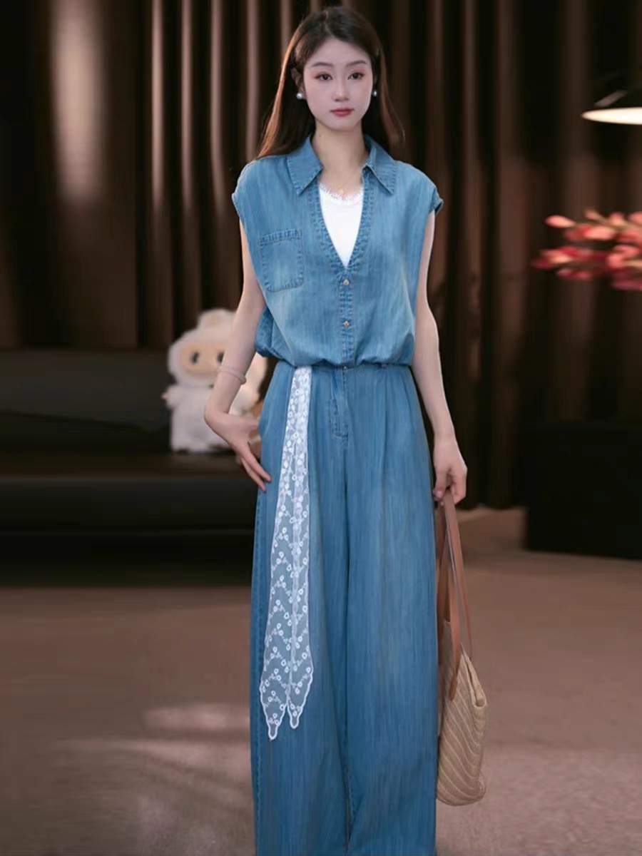 프랑스식 레트로 품격 데님 베스트 캐주얼 청바지 투피스 세트 세트