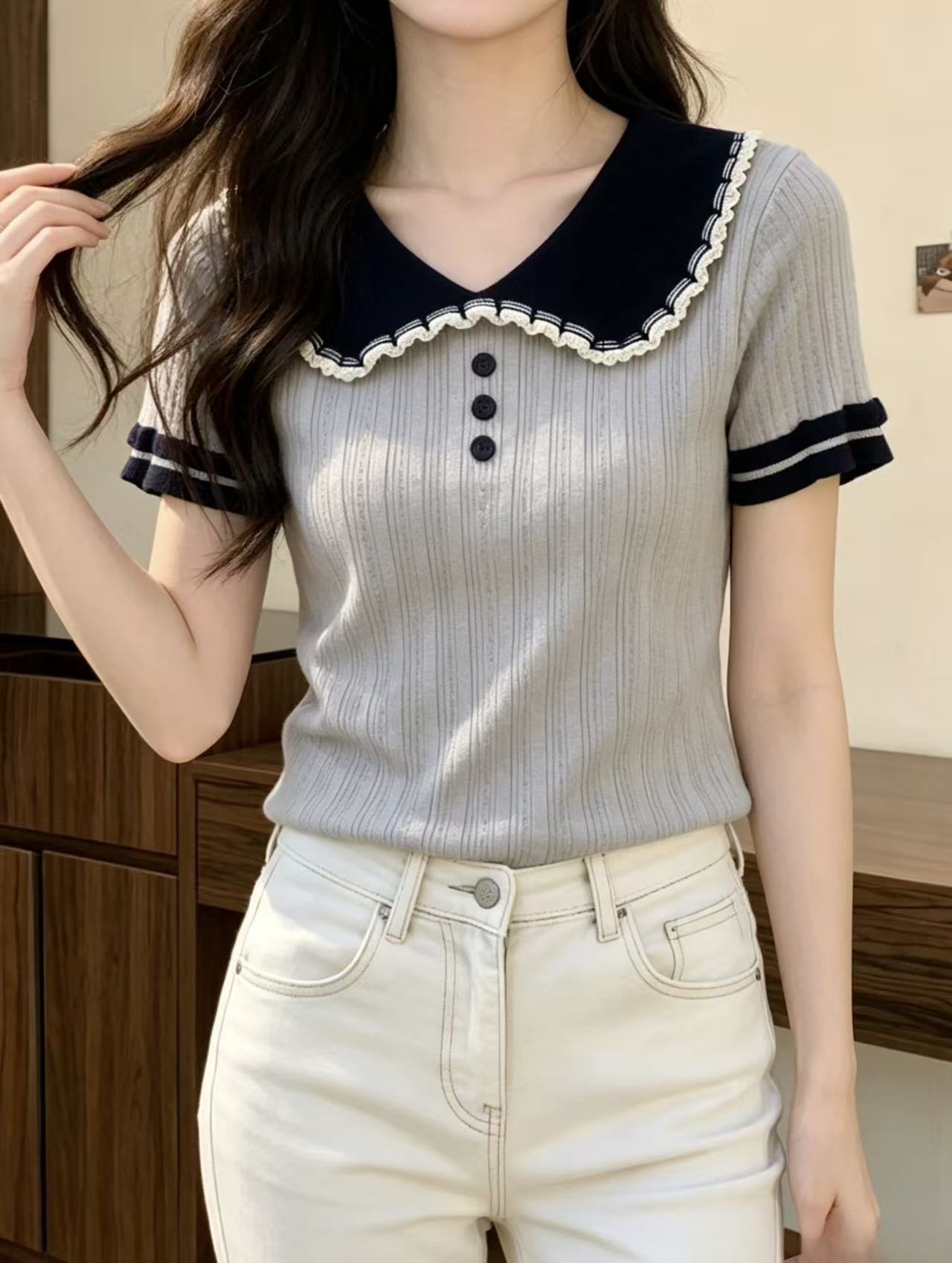 배색 레이스 베이비 칼라 반팔 니트 스웨터 여성 여름 새로운 부드러운 바람 달콤함 다용도 몸매 가꾸기 쇼트 스타일 맨위