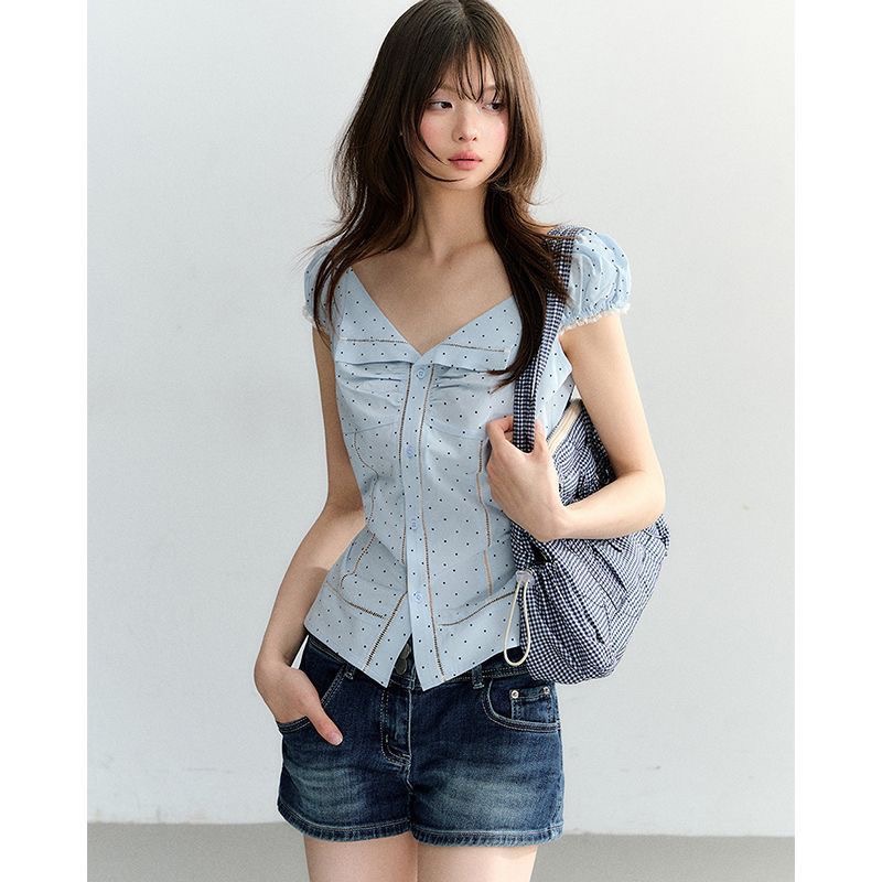 하늘색 도트 무늬 반팔 여성 셔츠 여름 착용 가져 가라. 레이스 거품 소매 허리 수축 셔츠 달콤함 한 첨부 된 의류