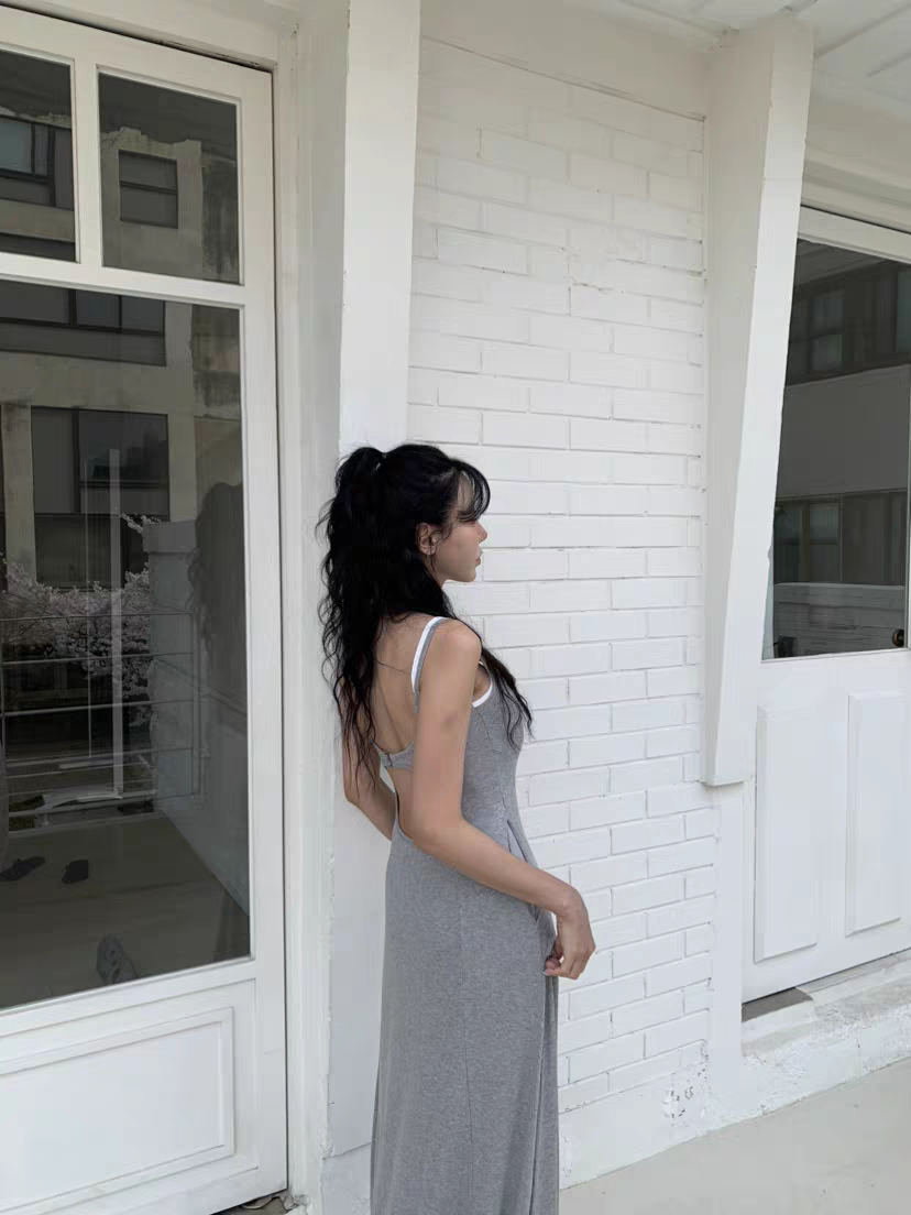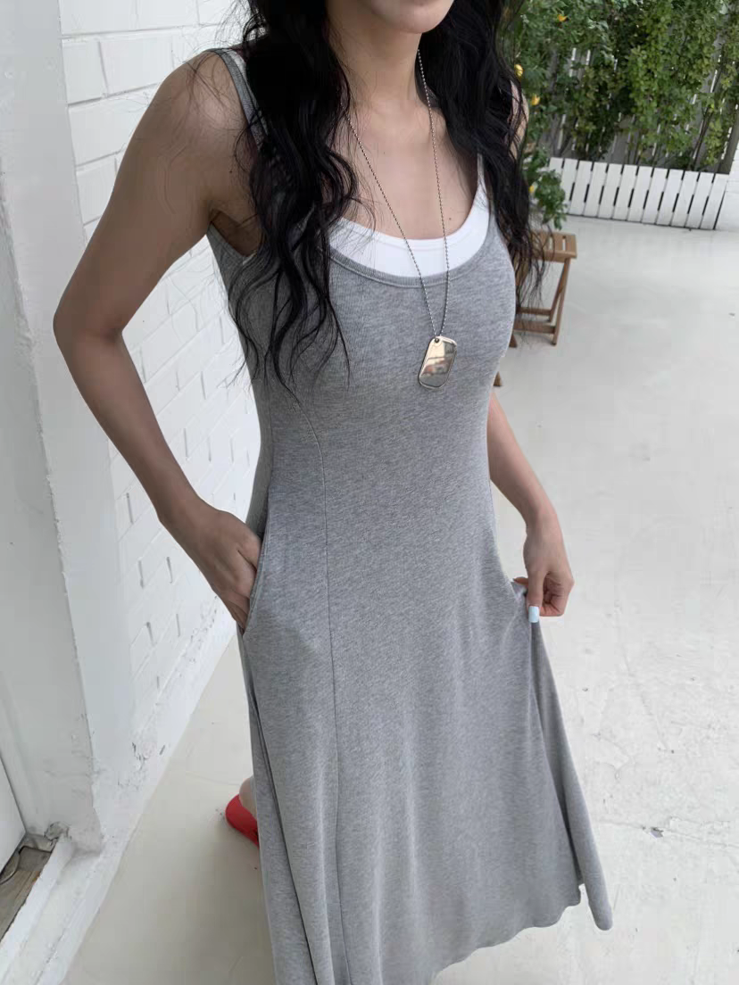재고 있음 한국 동대문 26 여름 낮은 네크라인 페이크 레이어드 무릎 아래 슬립 드레스