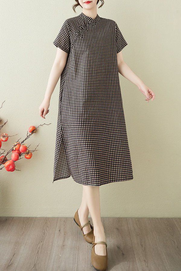 여름 빅 사이즈 여성 의류 면직물 작은 격자 루즈핏 캐주얼 다용도 개선 빅 사이즈 일상 반팔 치파오 중간 길이 스커트