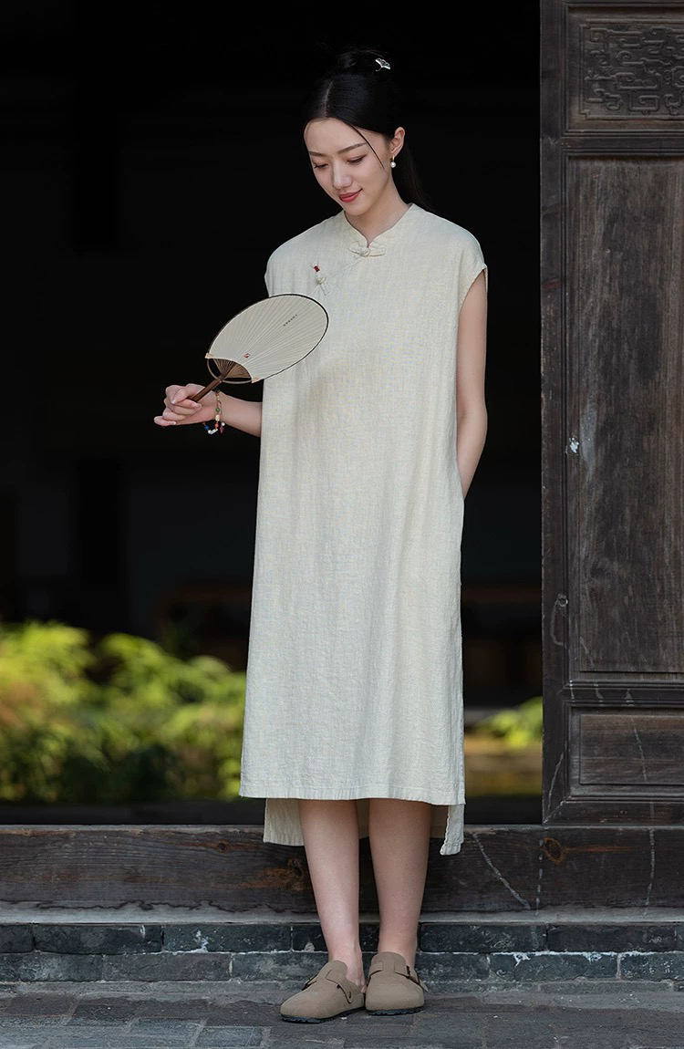 면 린넨 레트로 여성 드레스 여름 새로운 중식 스탠드 칼라 단추 차 서비스 치파오 라미 젠 민소매 롱 스커트