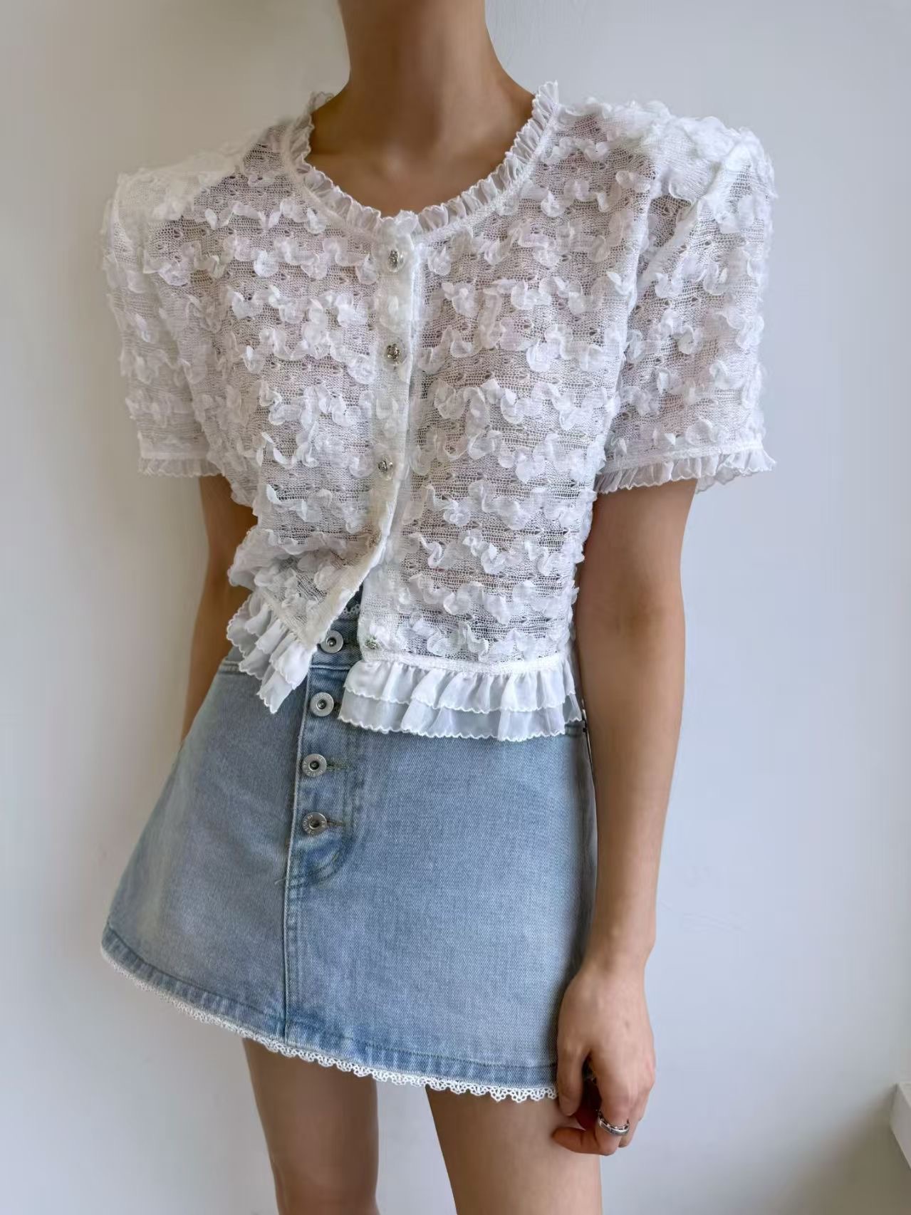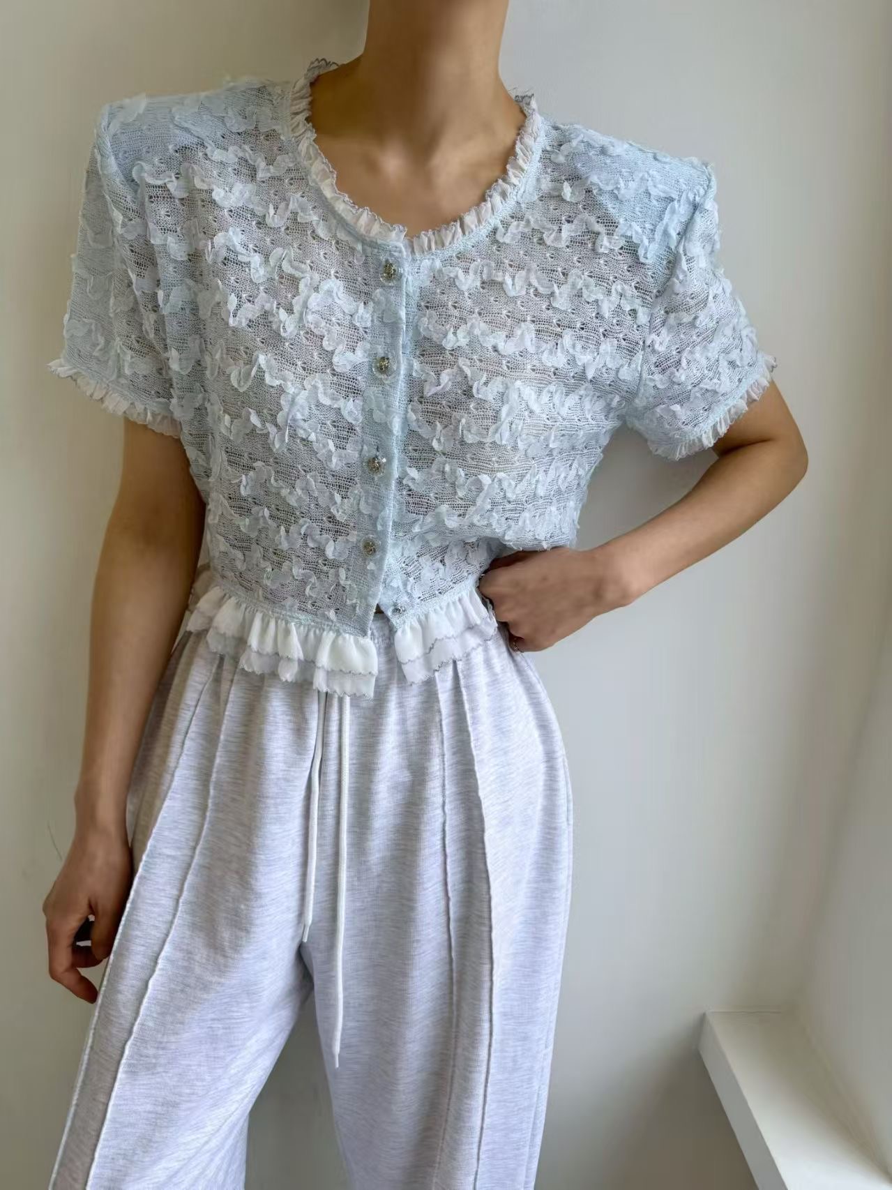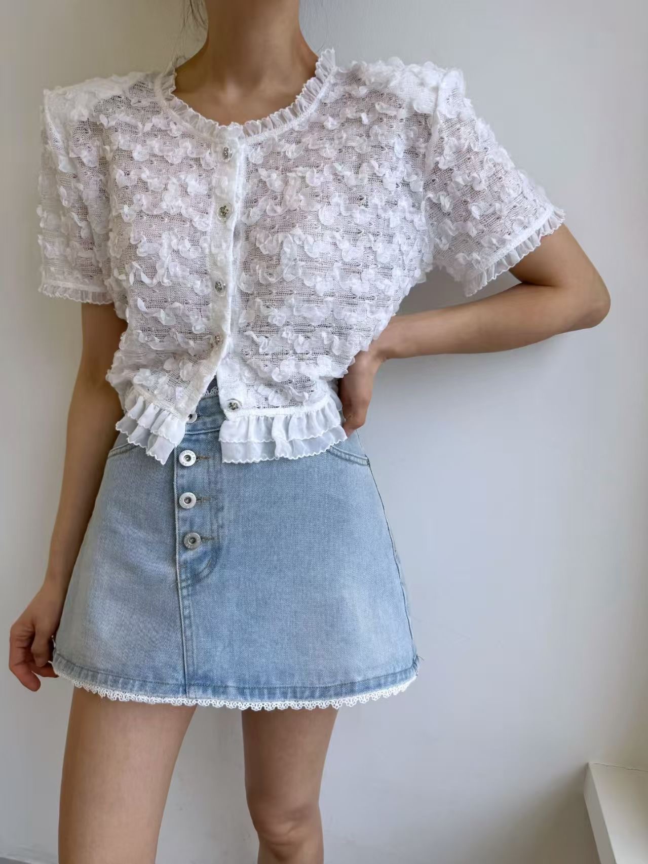 재고 있음 한국 여성 의류 해야한다 프랑스식 작은 샤넬 스타일 3 차원 꽃 자수 거품 소매 반팔 셔츠 여성 코트