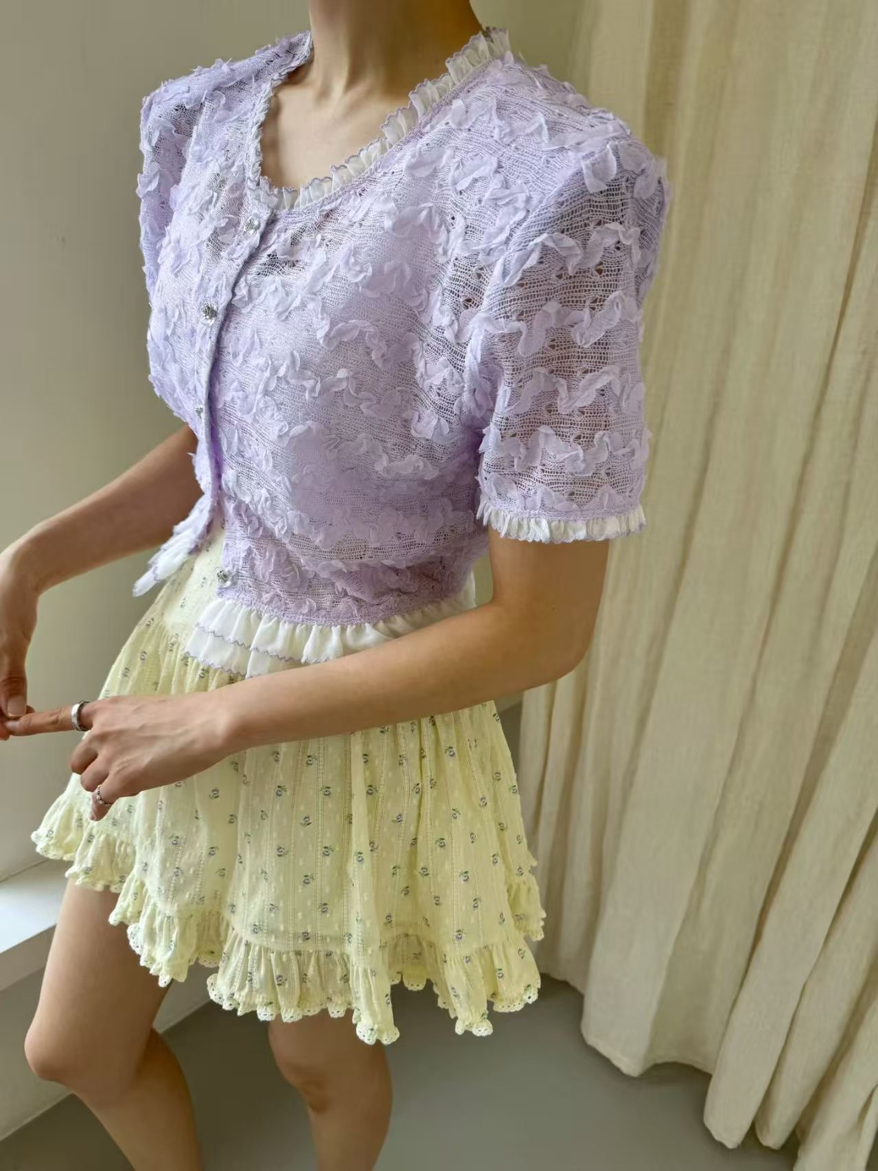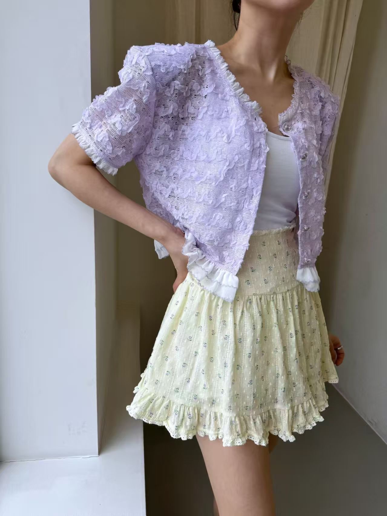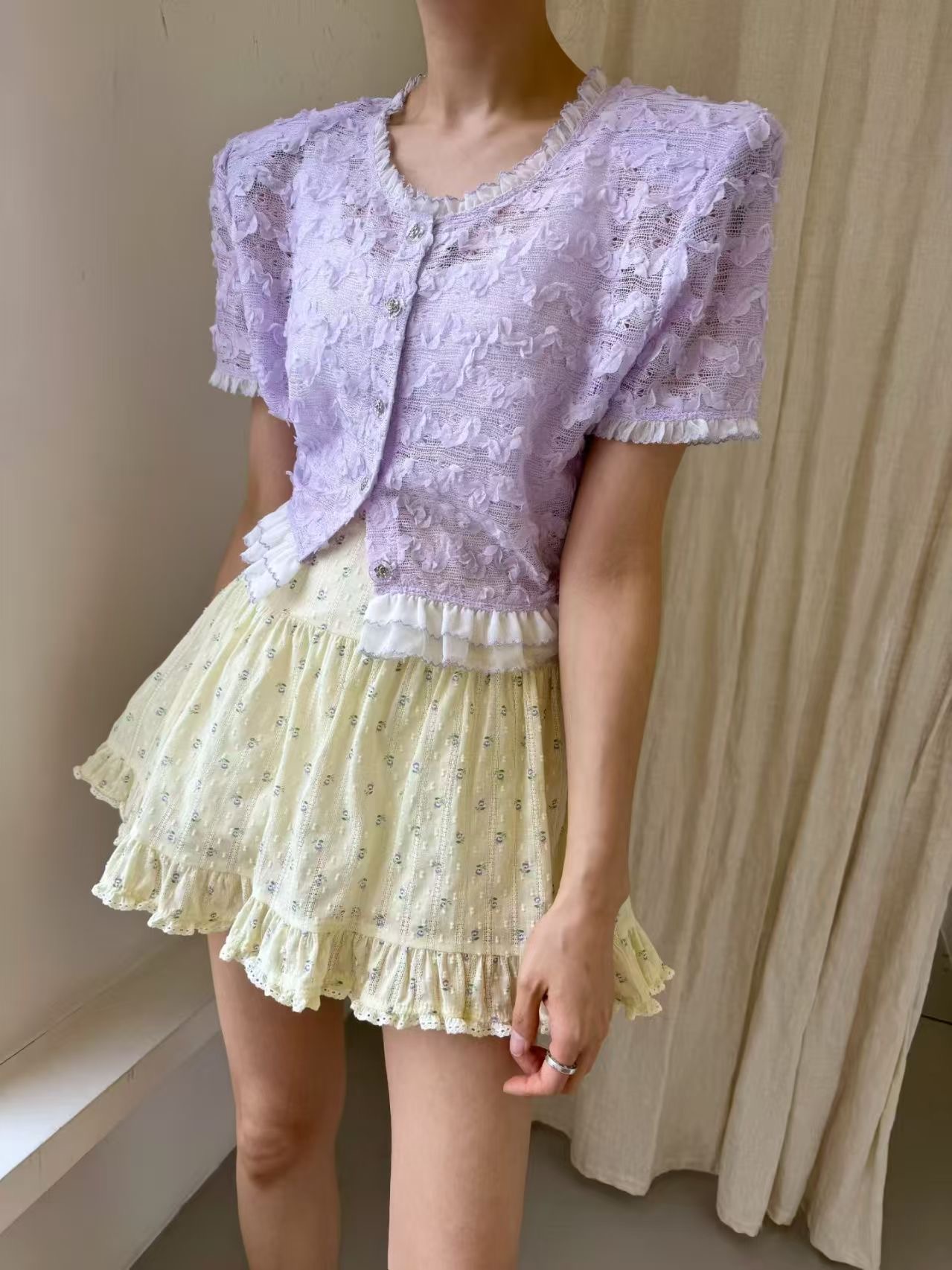 재고 있음 한국 여성 의류 해야한다 프랑스식 작은 샤넬 스타일 3 차원 꽃 자수 거품 소매 반팔 셔츠 여성 코트
