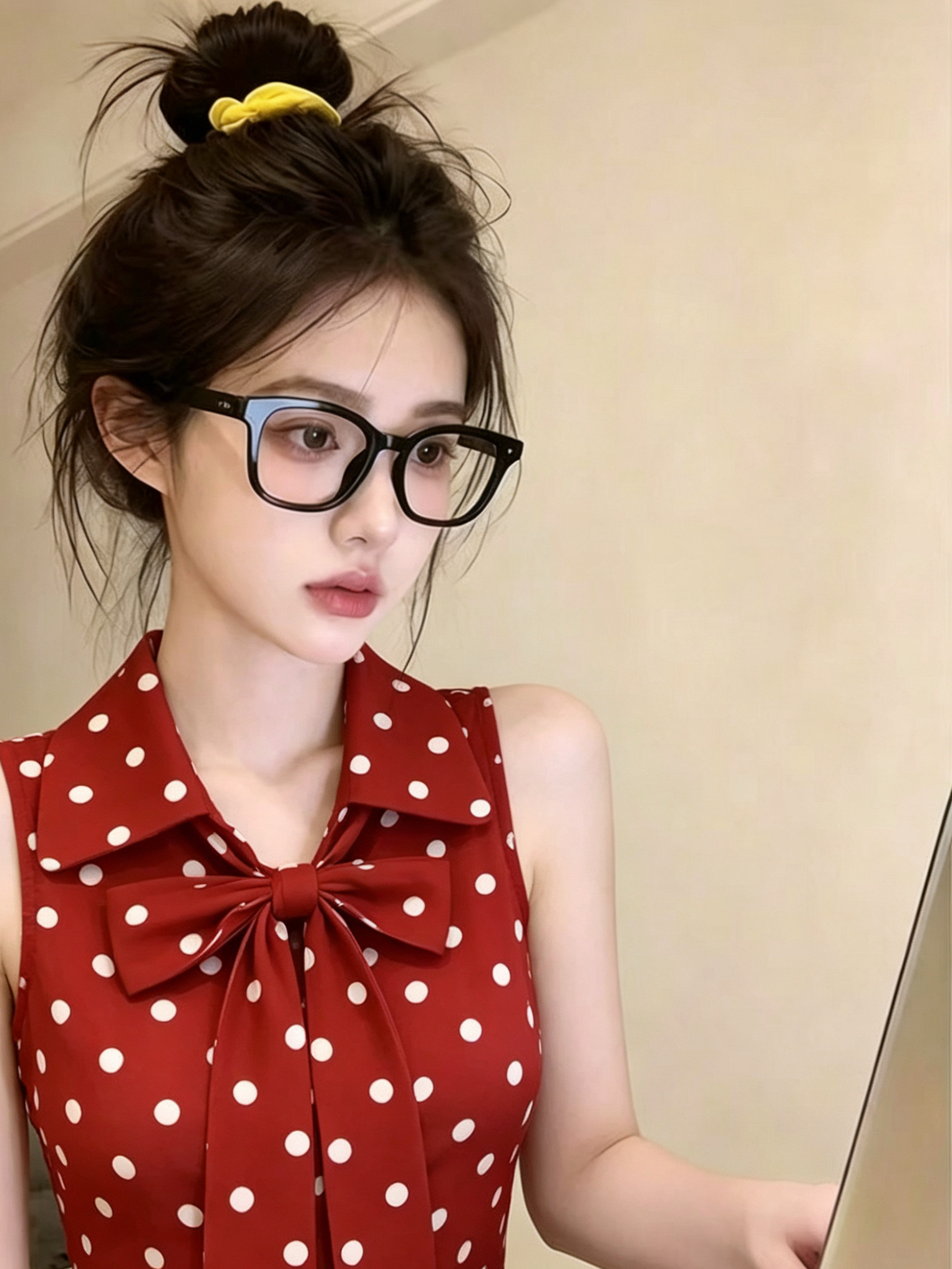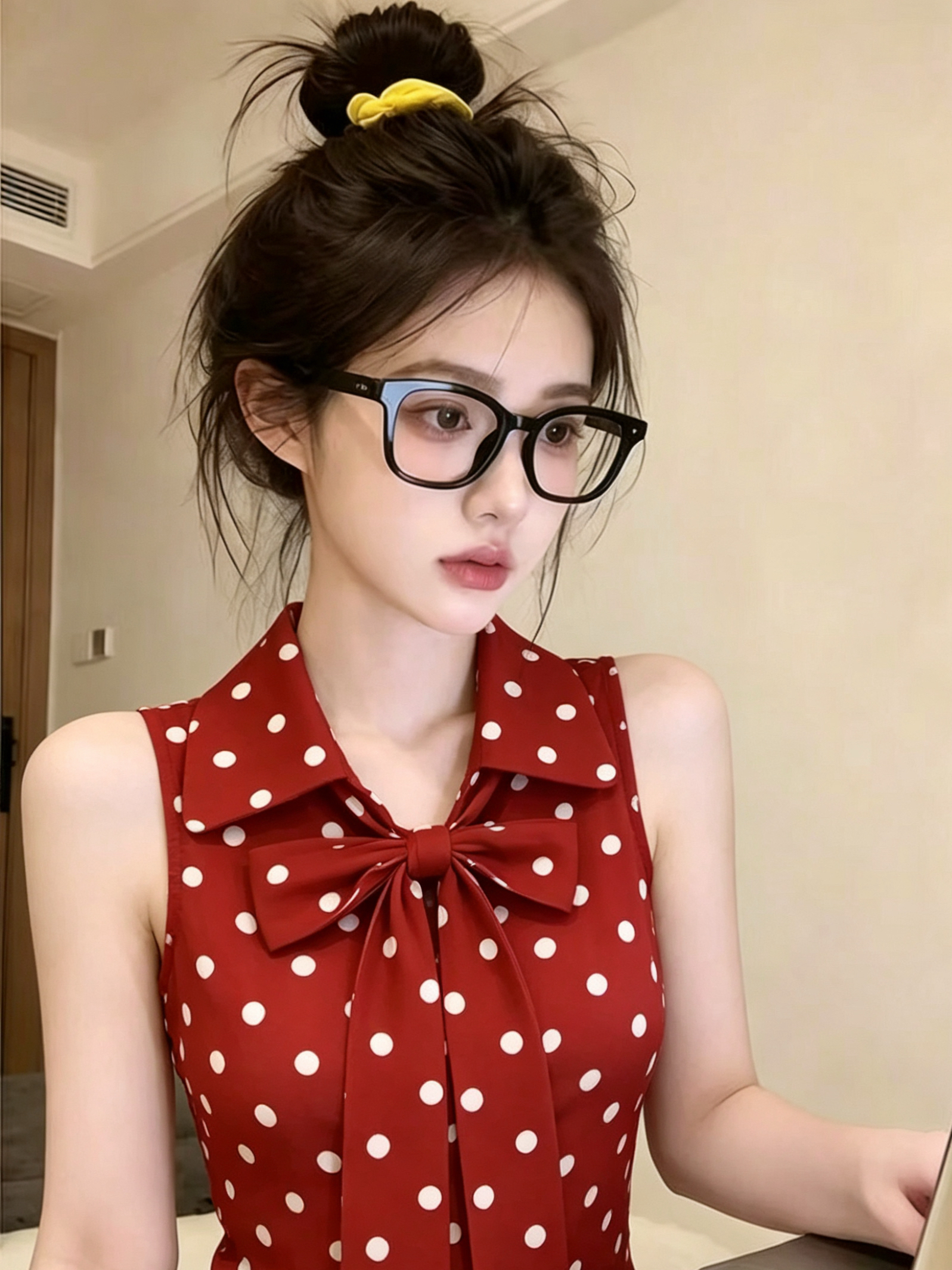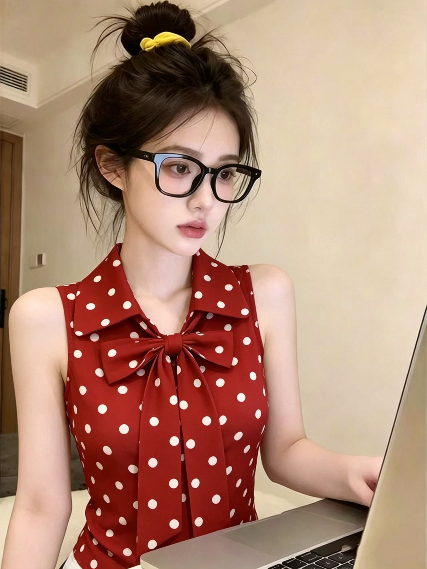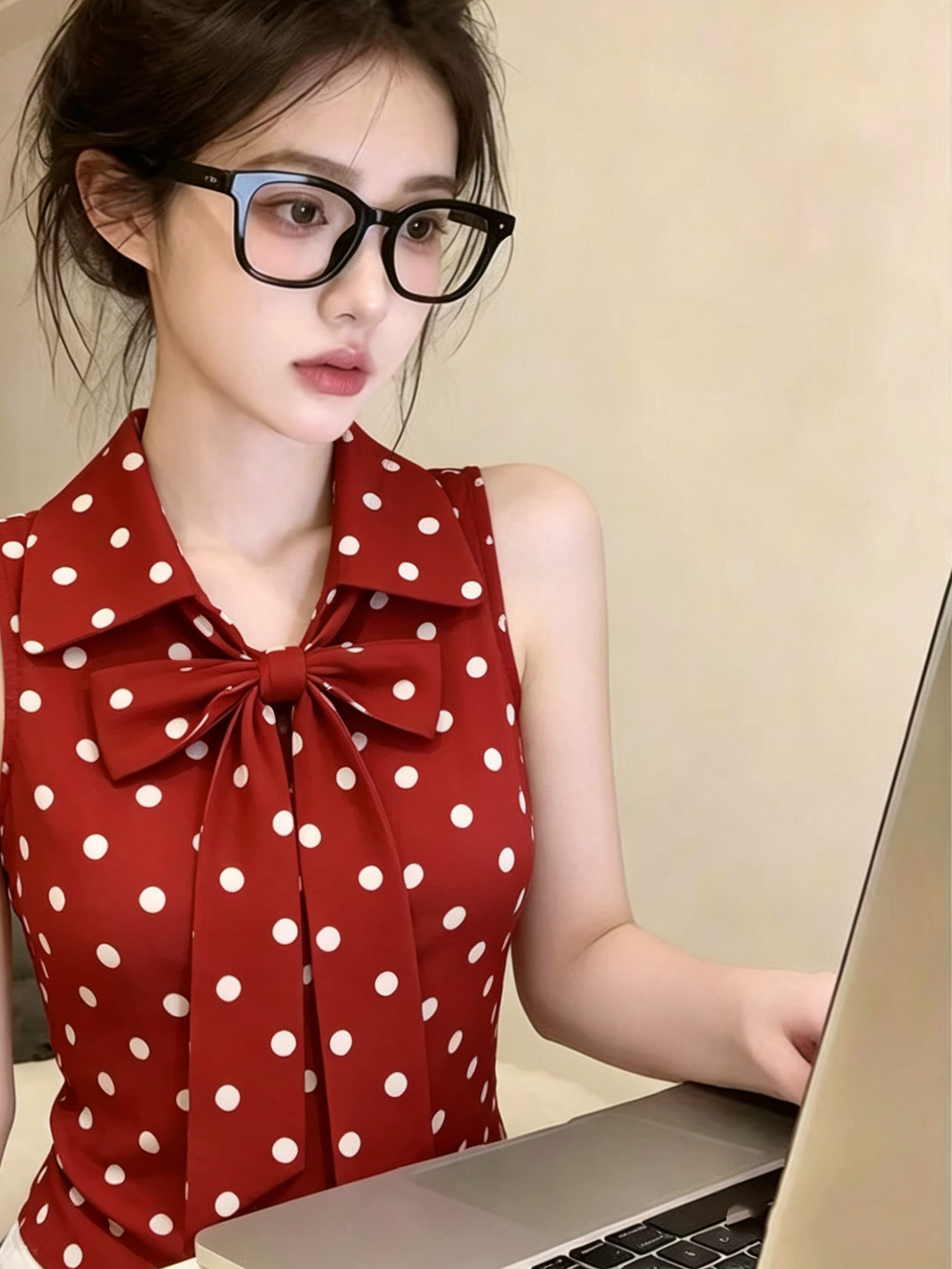 레트로 연인 빨간색 도트 무늬 민소매 여성 셔츠 여름 새로운 나비 매듭 스트랩 패션 출퇴근 연령 감소 맨위