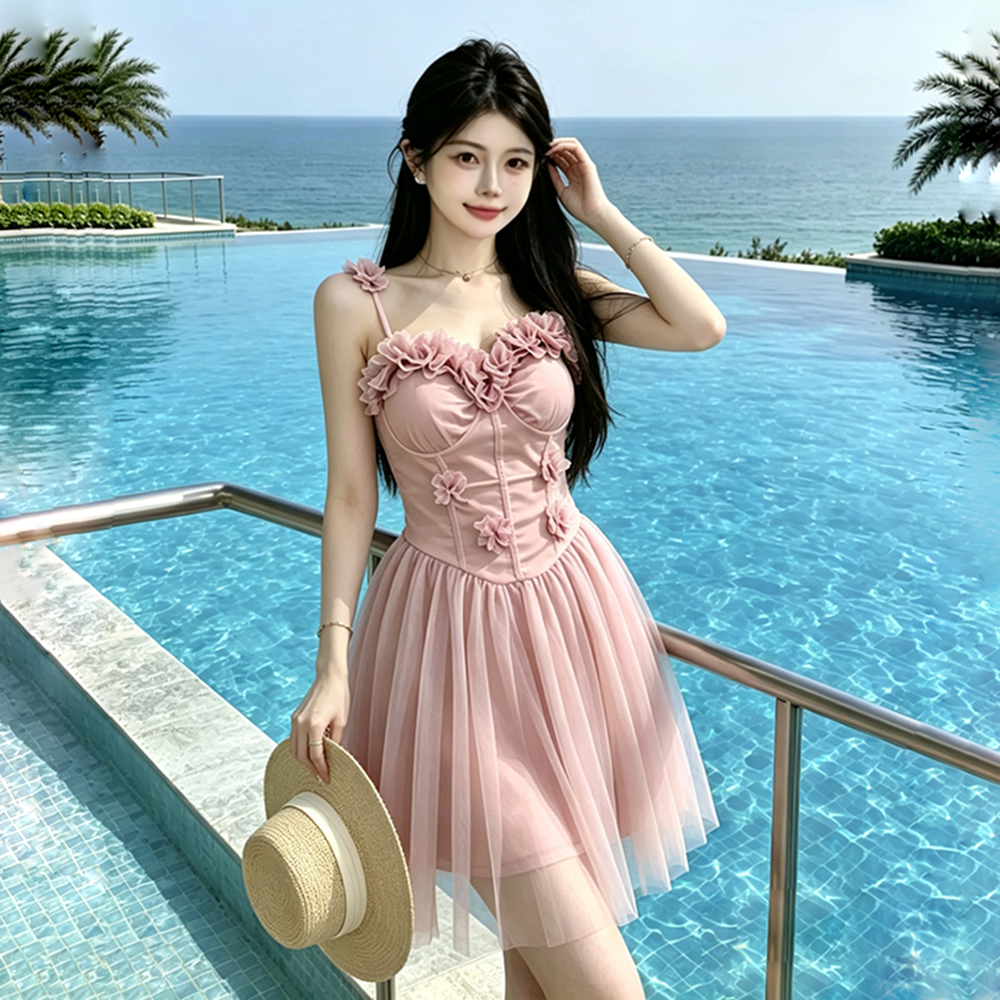 실사 요정 공차 가짜 바람 신선함 슬립 여성 드레스 여름 3 차원 망사 꽃 허리 수축 예복 미니 스커트