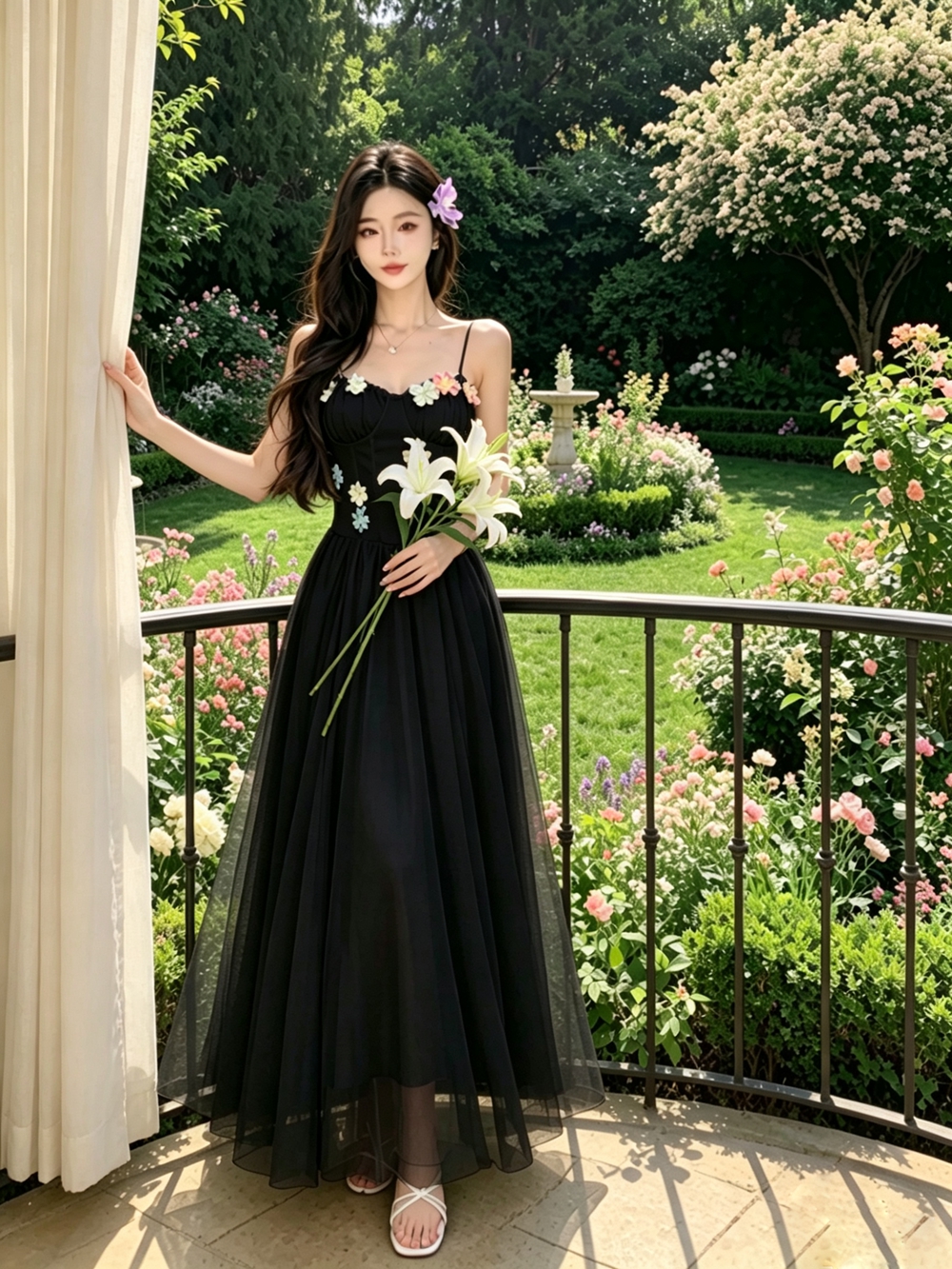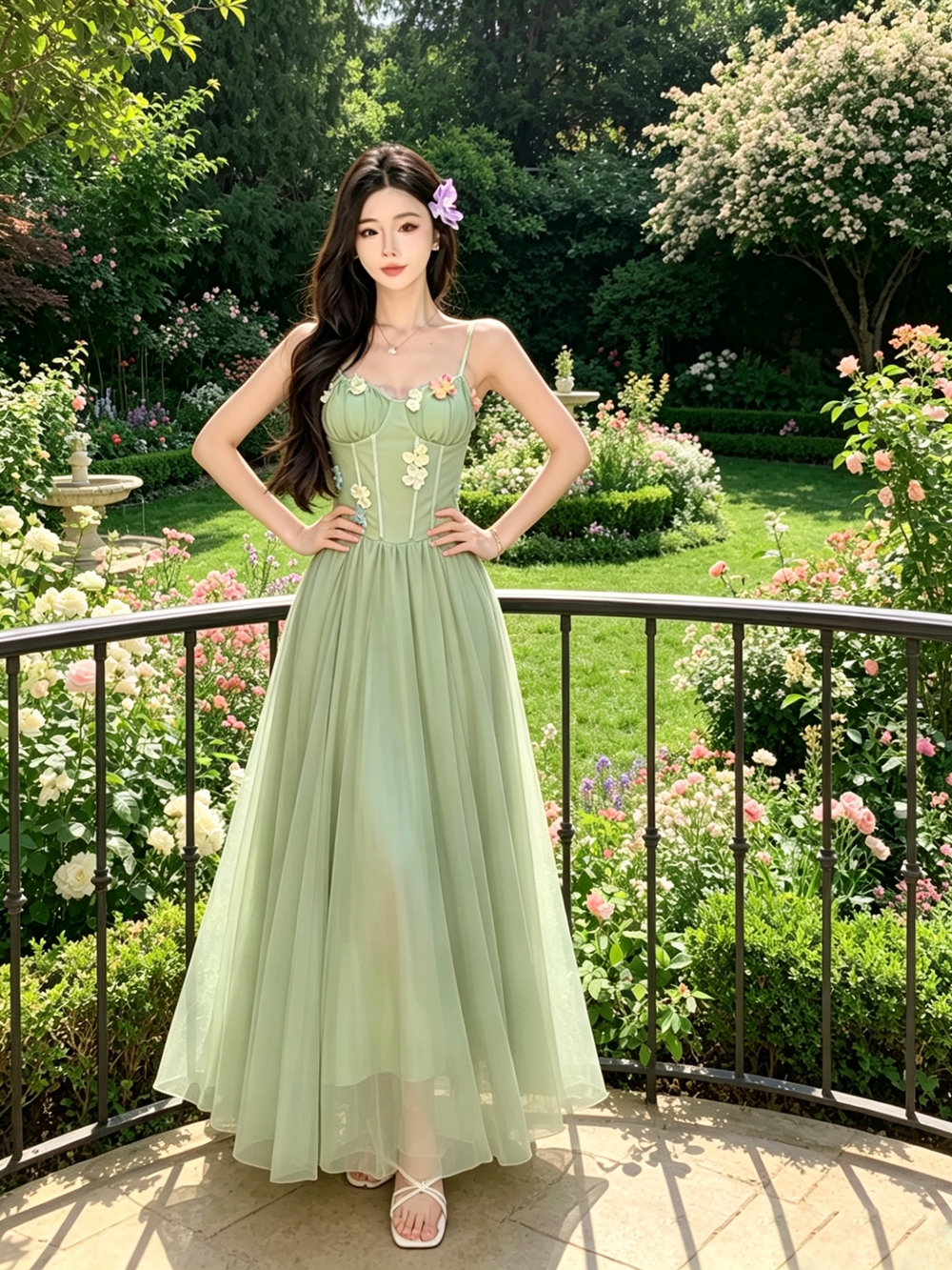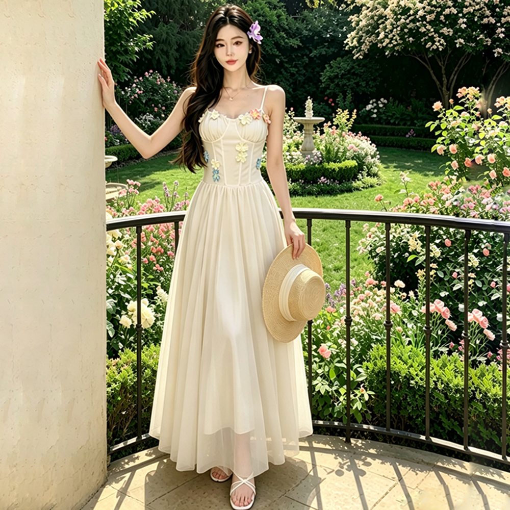 실사 핫걸 섹시함 낮은 가슴 허리 수축 큰 진자 꽃 숄더백 슬립 드레스 순수한 욕망 슬림해 보이는 연회 예복 치마