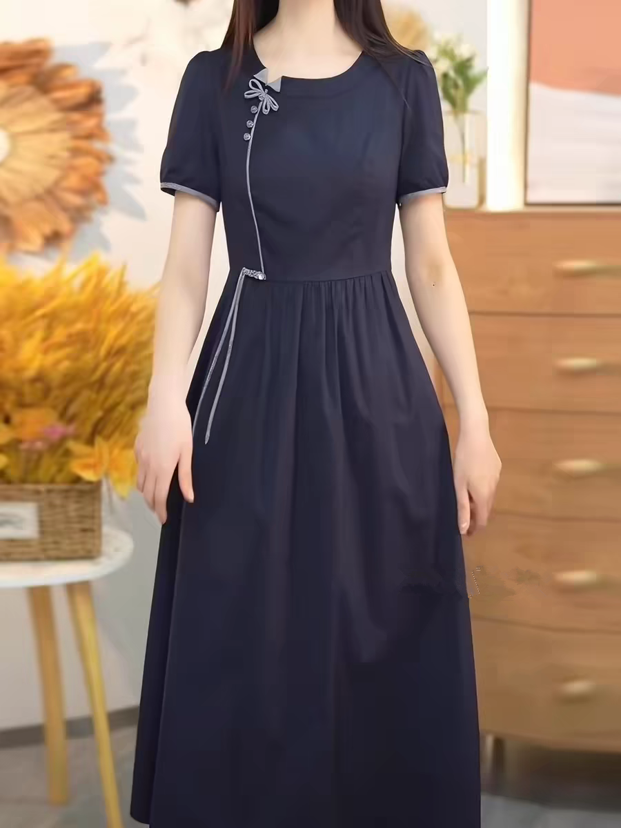 새로운 중식 국풍 연령 감소 품격 반팔 여성 드레스 2026 여름 새로운 중간 길이 외국 가스 슬림해 보이는 A라인 스커트