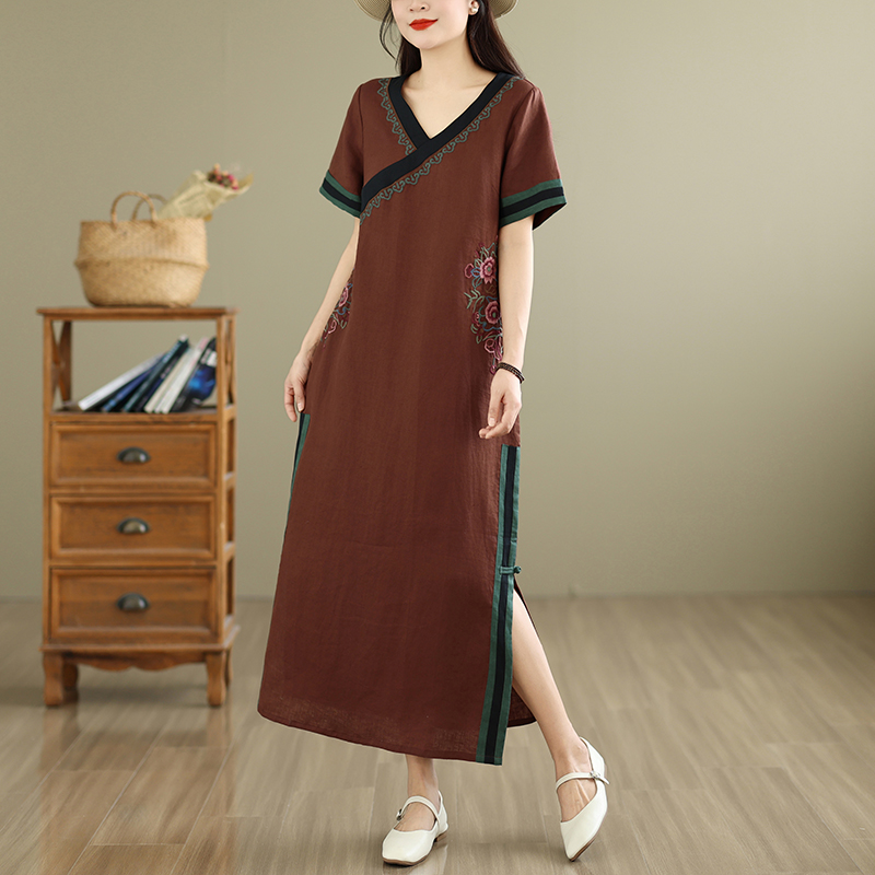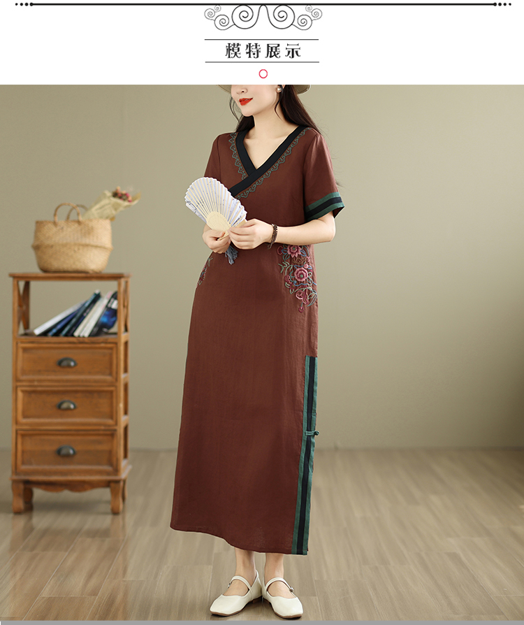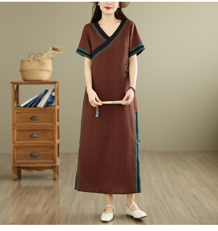 민족 스타일 무거운 작업 자수 면 린넨 드레스 2026 여름 새로운 V넥 슬림해 보이는 레트로 우아함 품격 롱 스커트