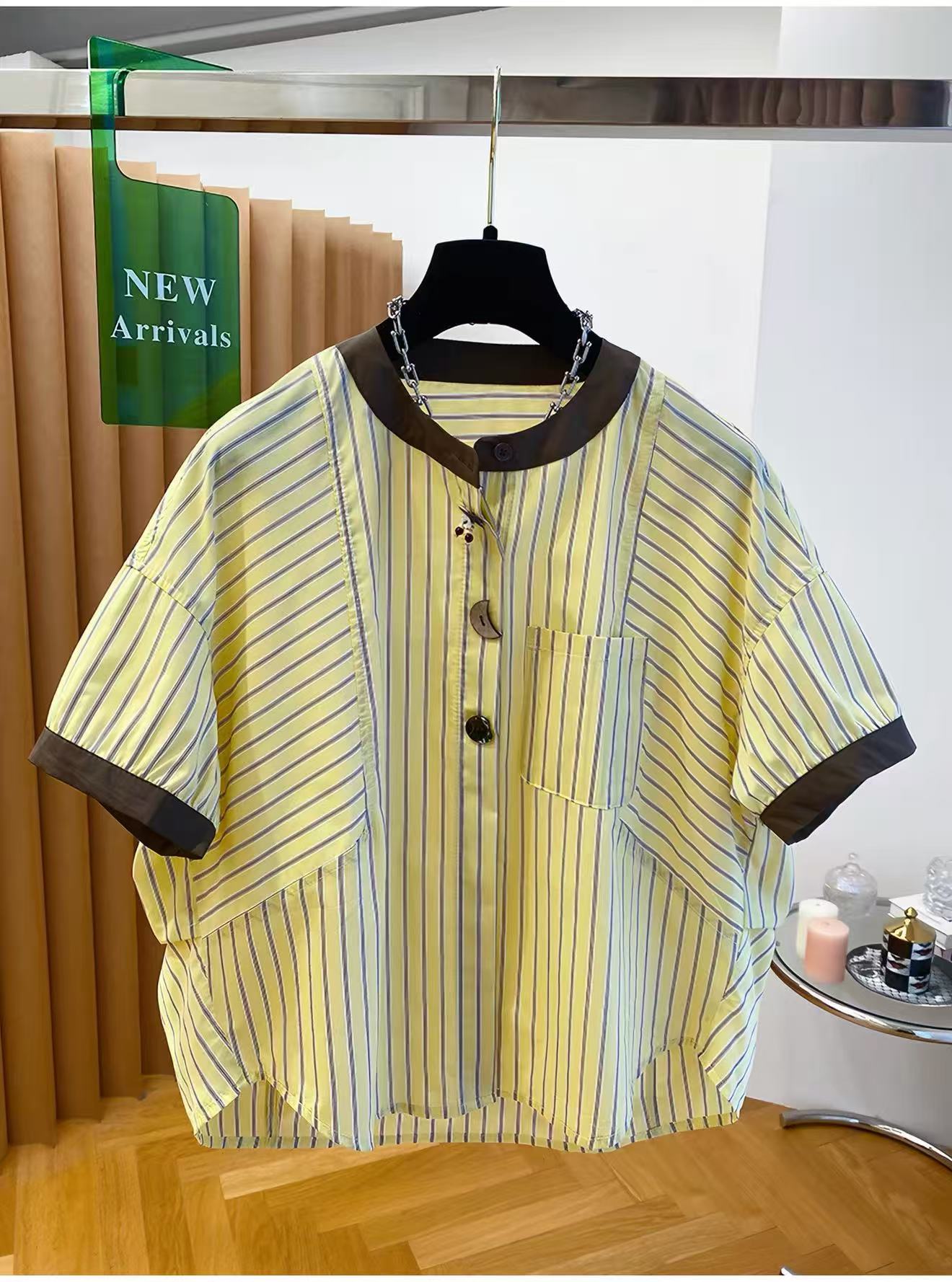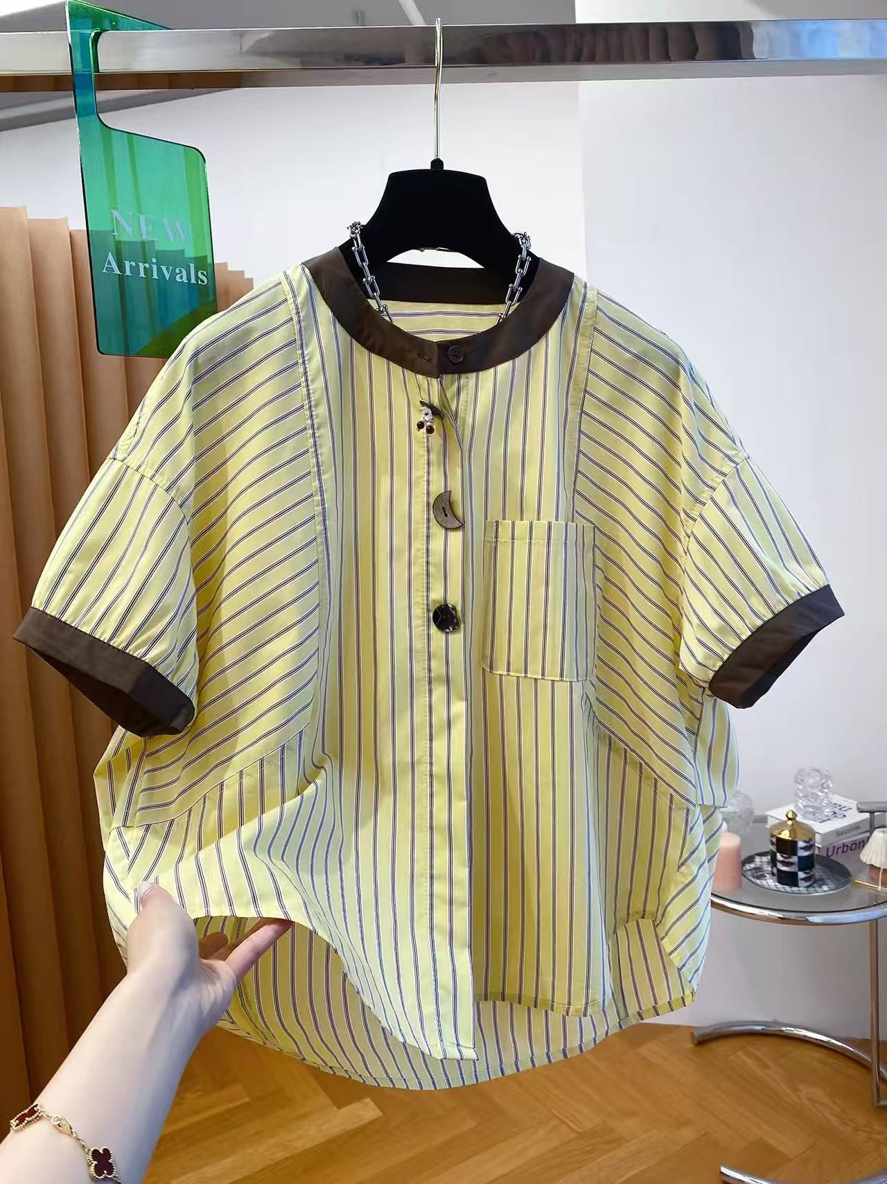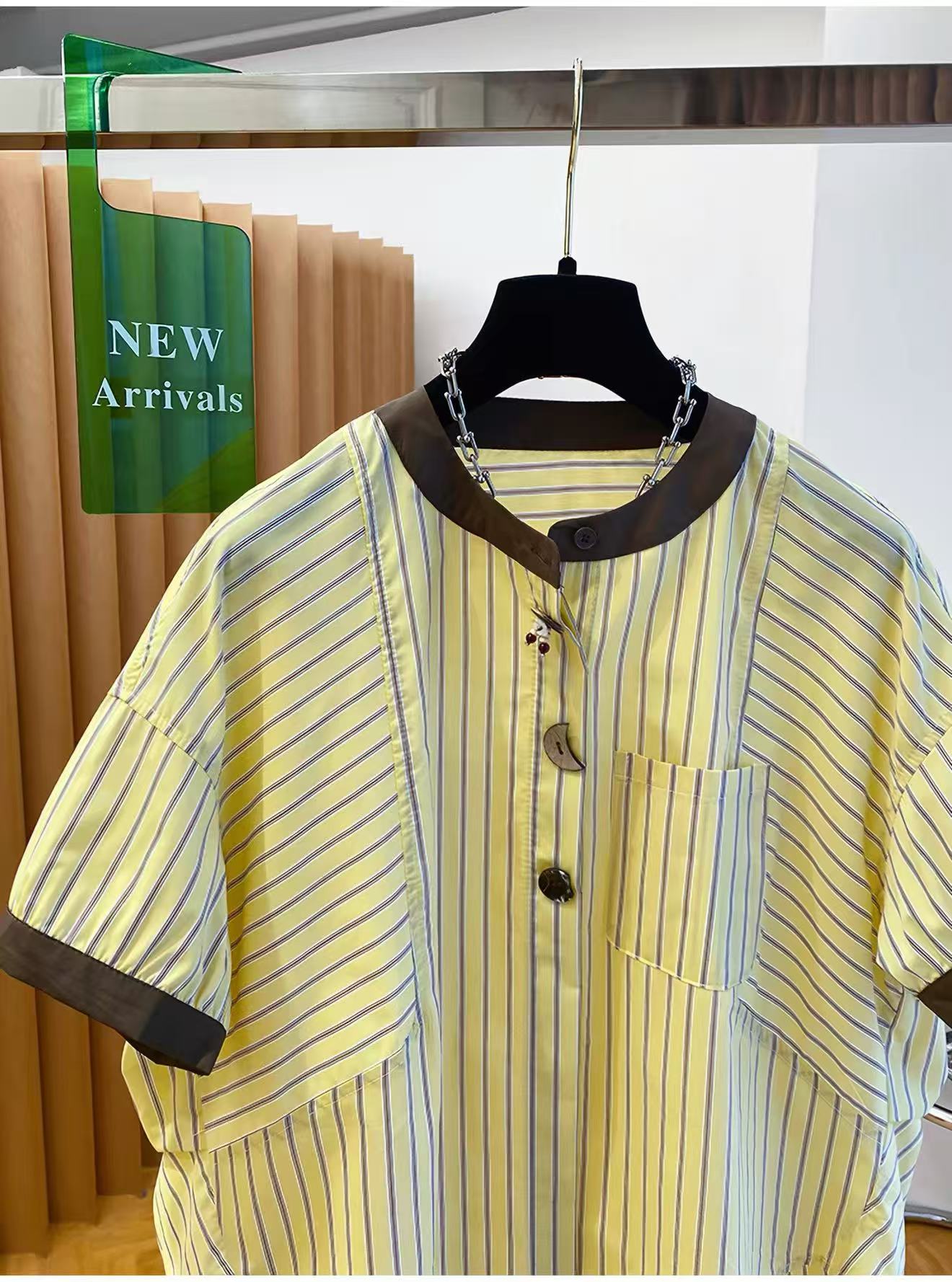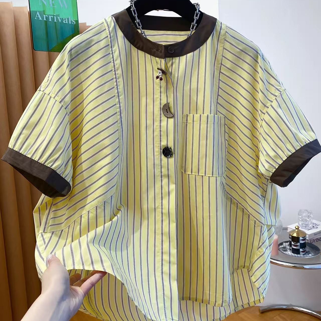 황색 스트라이프 셔츠 여성용 짧은 소매 2026 새로운 여름 루즈핏 캐주얼 다용도 라운드 넥 자이언트 잘 생긴 셔츠 맨위