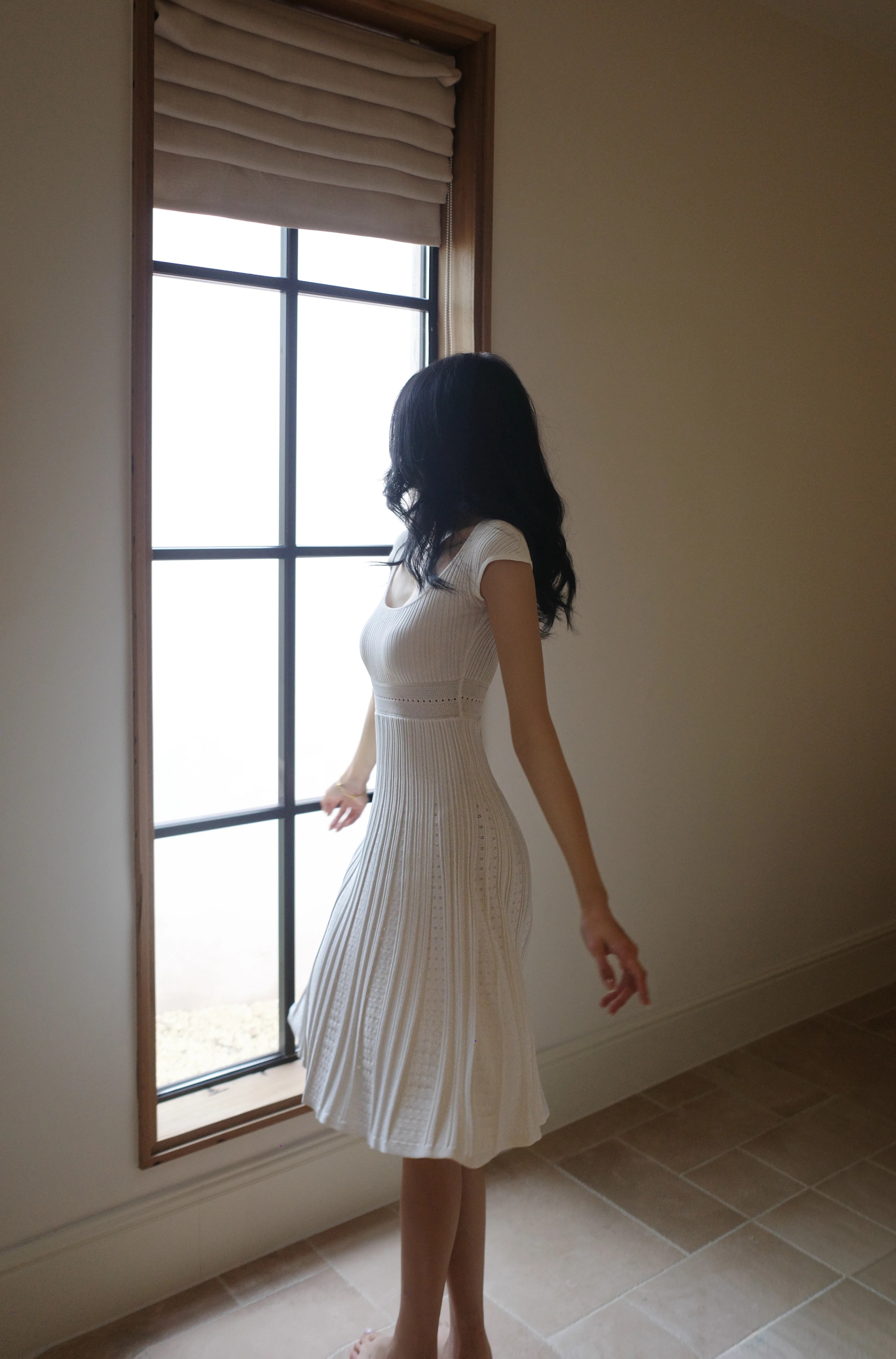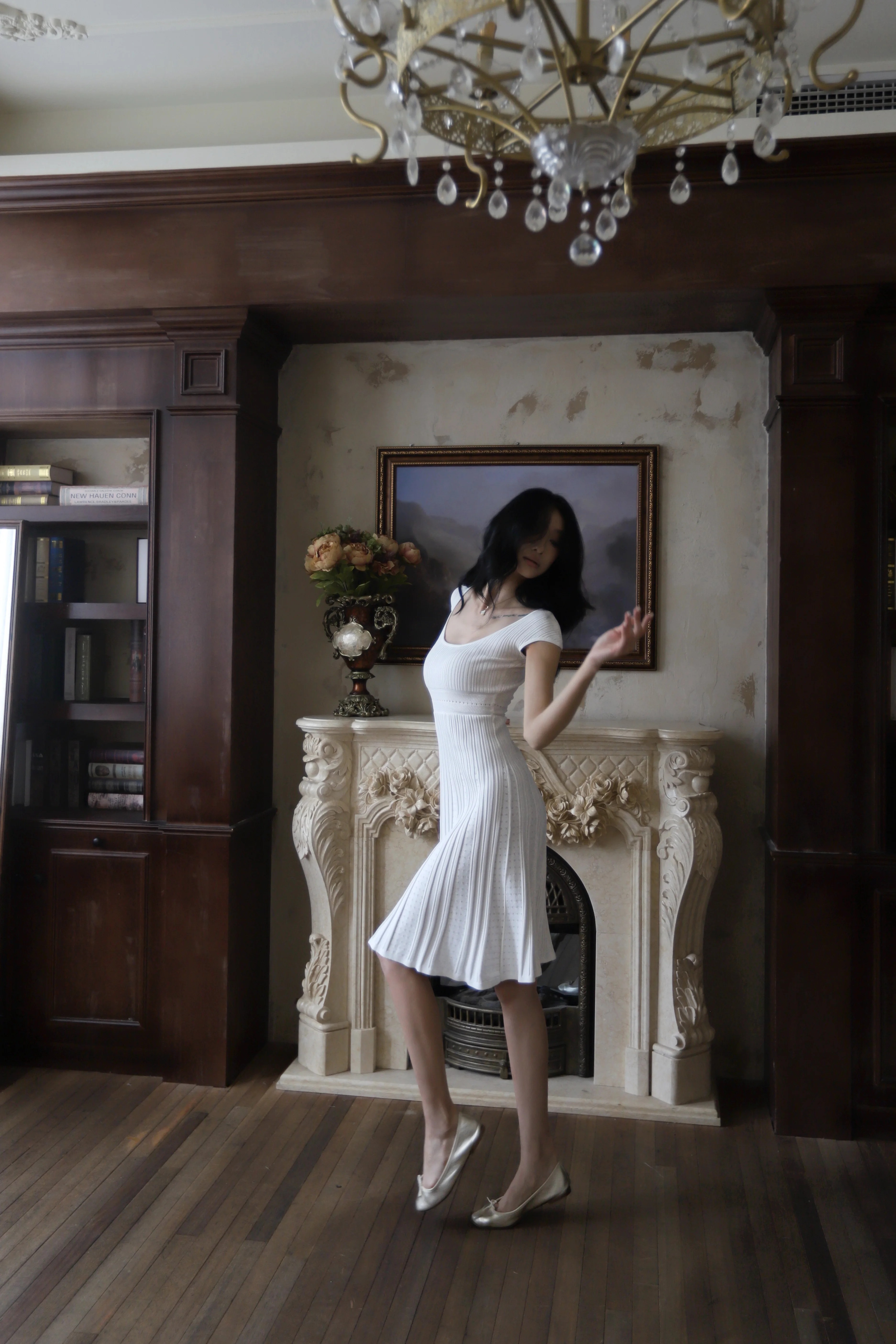 skinless 하얀 백조 프랑스식 u 칼라 진자 중간 길이 드레스 얼음 센스 높음 폭탄 허리 수축 자카드 디자인