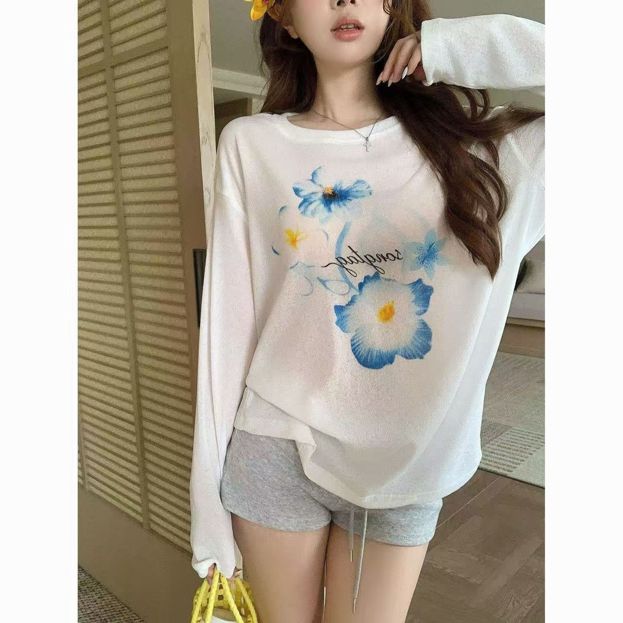 휴가 바람 착용 가져 가라. 얇은 스타일 루즈핏 꽃 자외선 차단 블라우스 여름 마이크로 ~을 통해 긴팔 캐주얼 티셔츠 스택 착용 맨위 여성