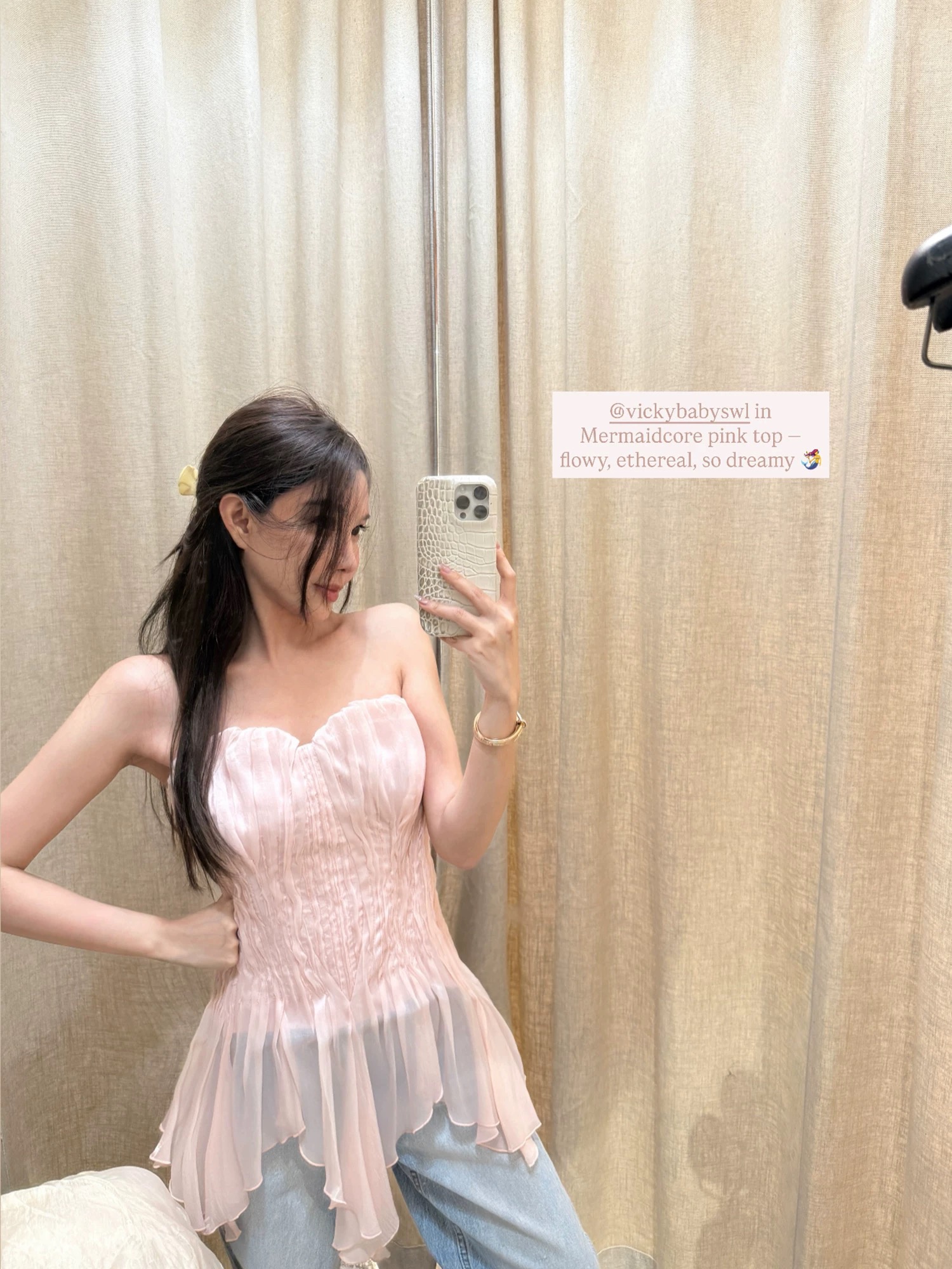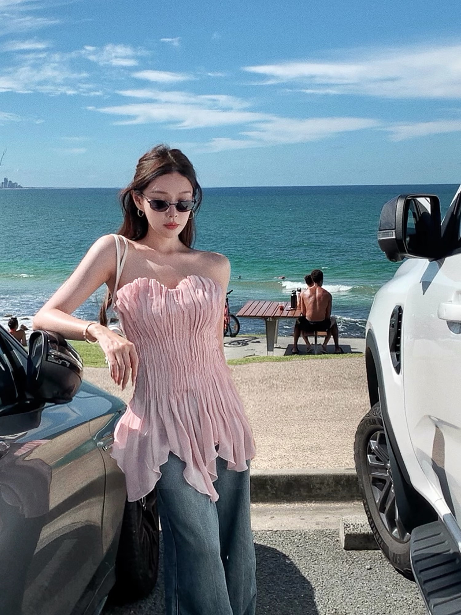 시 웨이 리앙 분말 안개 인어 이른 봄 요정 가스 수공 펌프 Pleat 몸 전체 명중 가져 가라. 조개 가슴 종류 튜브탑 맨위 여성