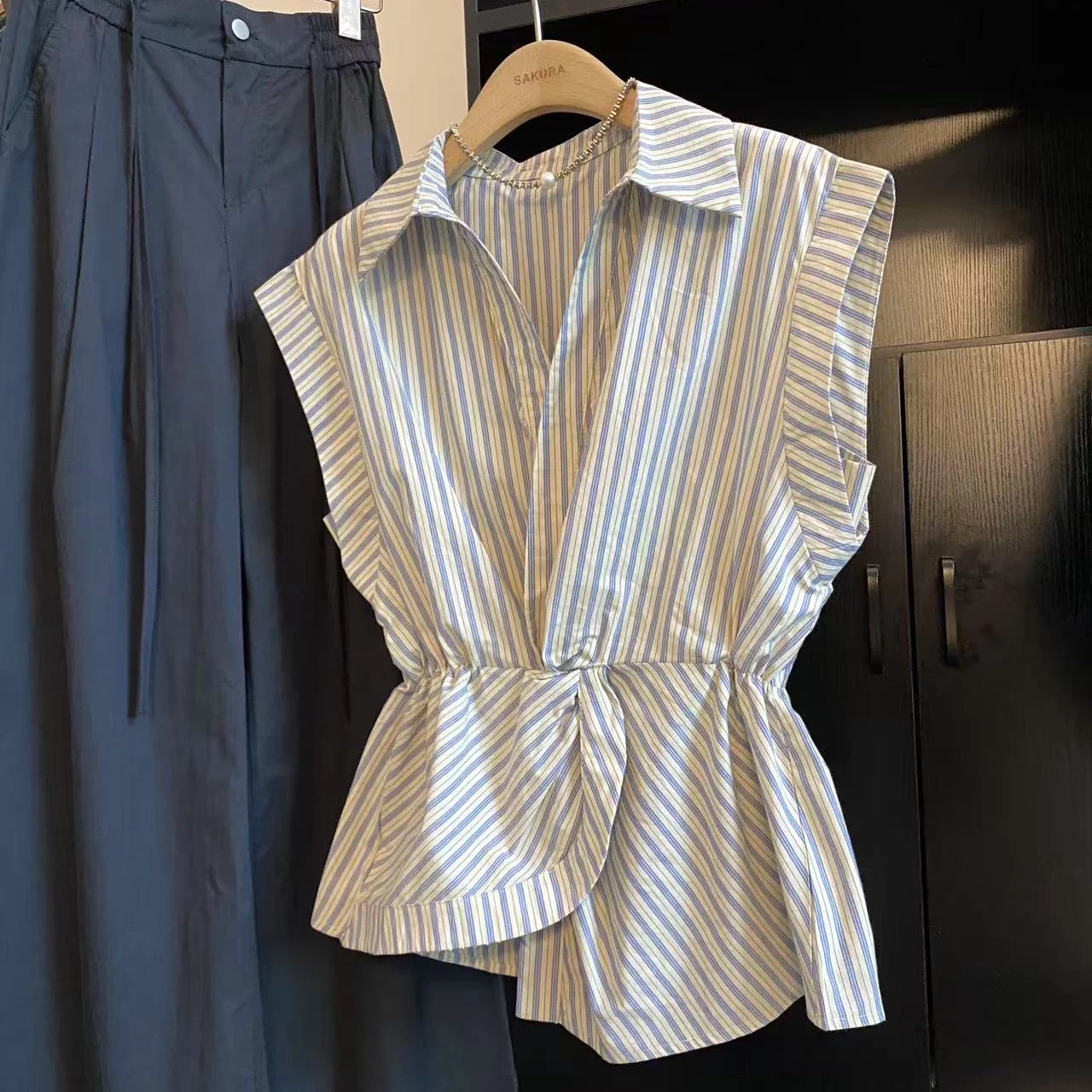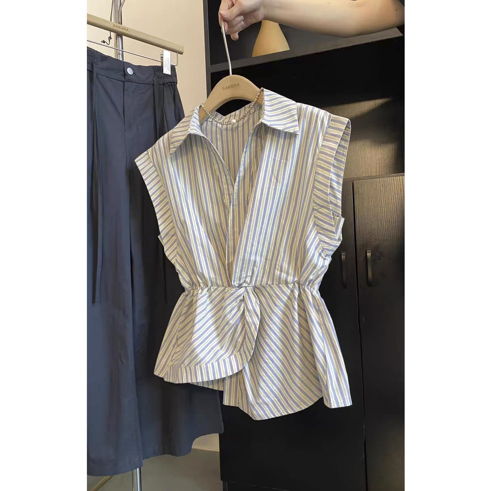 한 부서 품격 POLO 칼라 스트라이프 패치워크 민소매 여성 셔츠 여름 출퇴근 다용도 몸매 가꾸기 슬림해 보이는 어깨 맨위