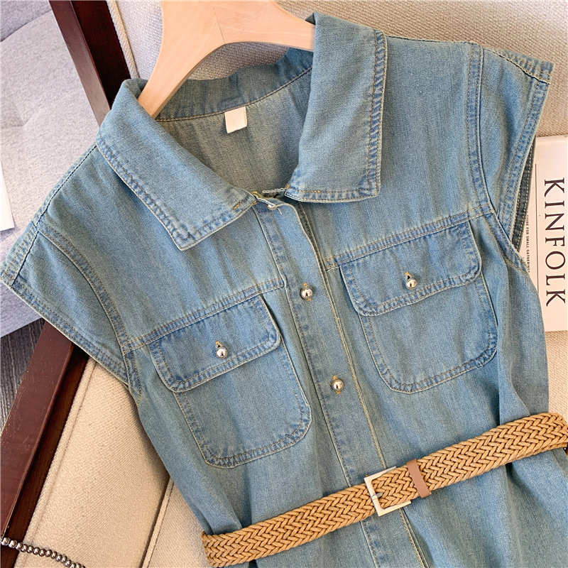 2025 여름 새로운 레트로 디자인 센스 폴로 칼라 민소매 허리 수축 슬림해 보이는 한 마디 롱 스커트 거친 가장자리 데님 여성 드레스