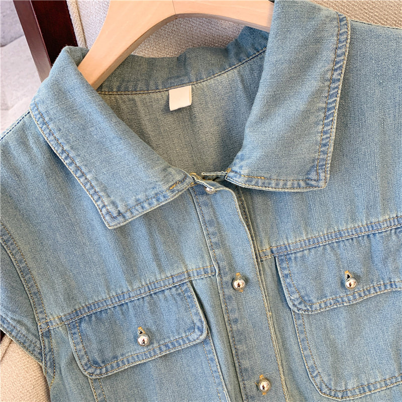 캐주얼 느긋한 반팔 데님 여성 셔츠 여름 셔츠 프랑스식 고급 디자인 센스 자수 루즈핏 품격 맨위
