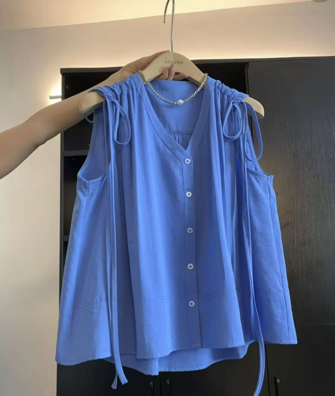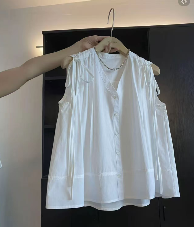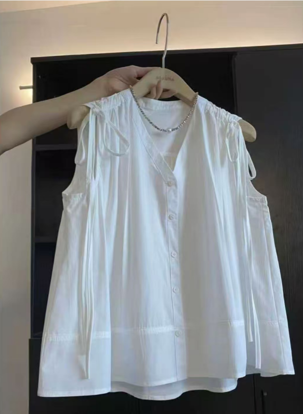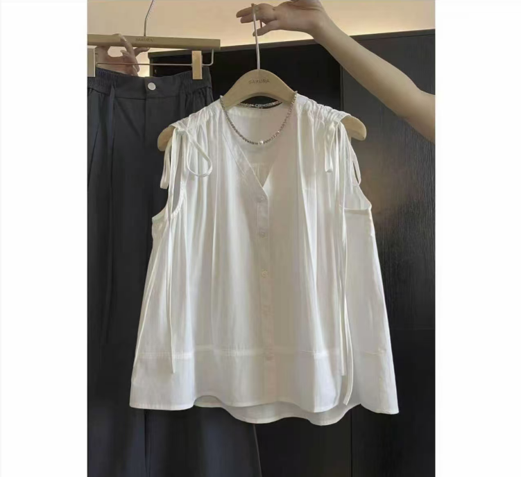 2026 여름 새로운 프랑스식 익스트림 제인 바람 화이트 민소매 V넥 프릴 셔츠 허리 수축 슬림해 보이는 다용도 맨위
