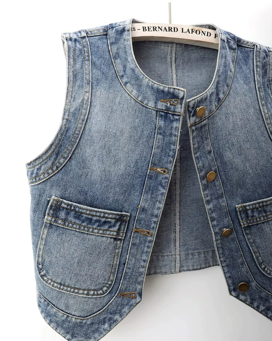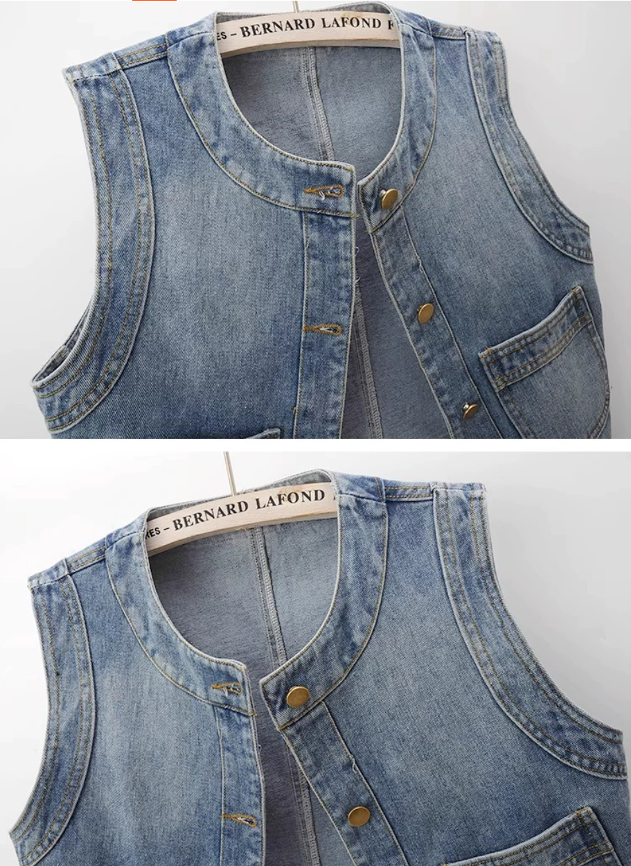 2026 새로운 여름 슈퍼 화재 연령 감소 쇼트 스타일 데님 여성 코트 진한 파란색 라운드 넥 스택 착용 베스트 조끼 맨위