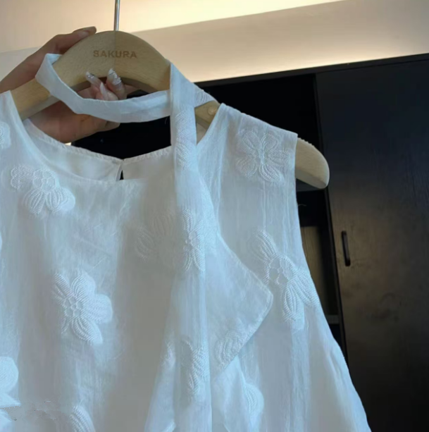 3 차원 꽃 자수 민소매 화이트 조끼 여성 2025 여름 새로운 부드러운 연령 감소 한 부서 슬립 짧은 맨위