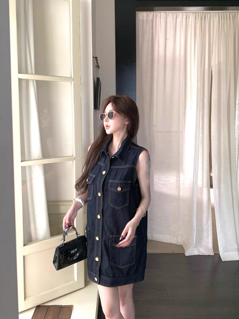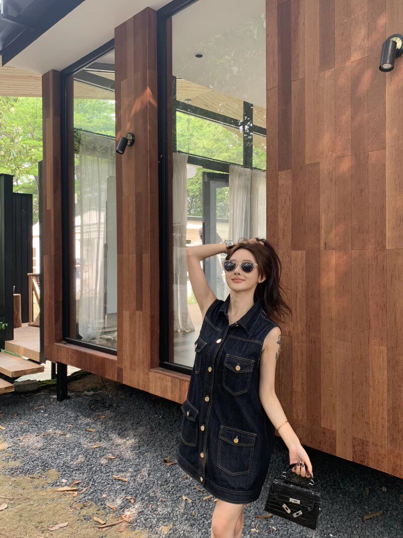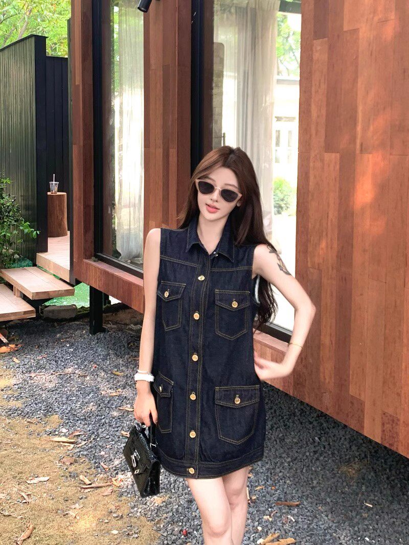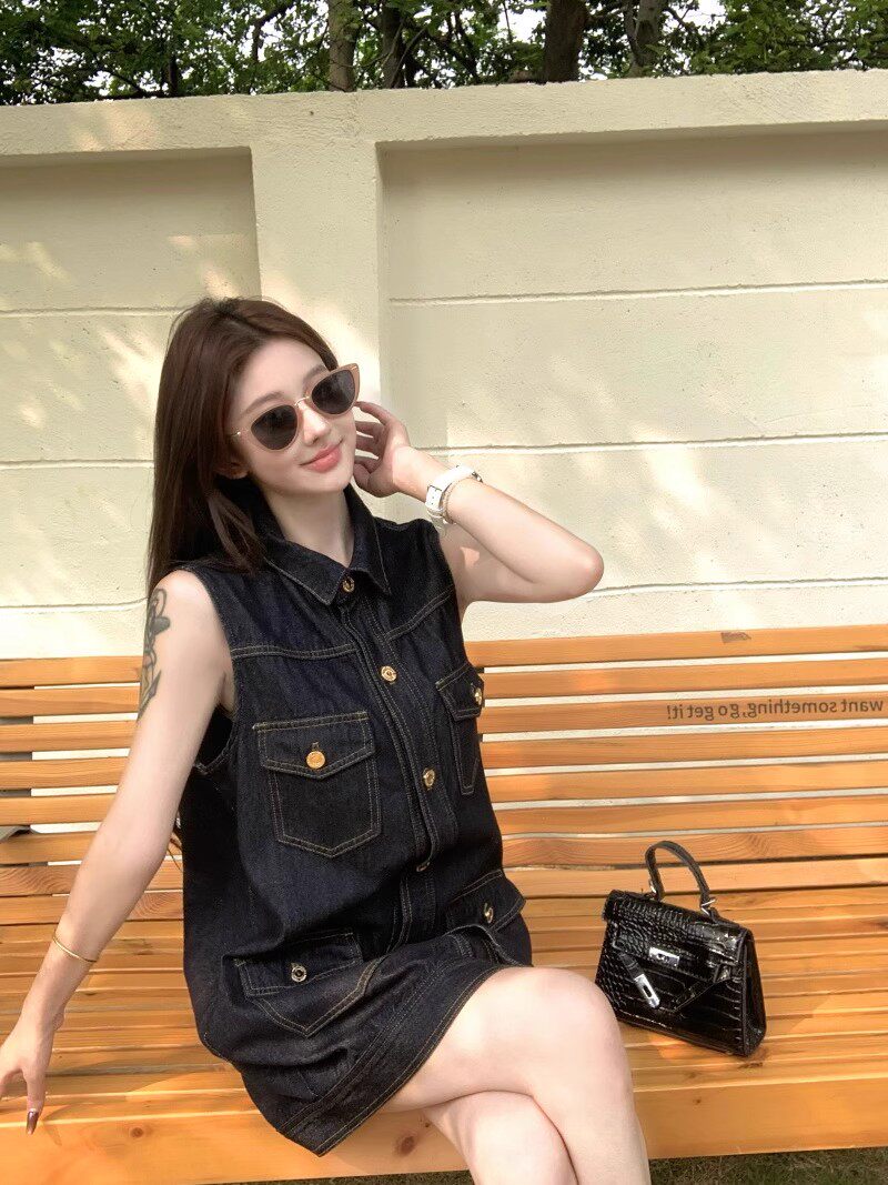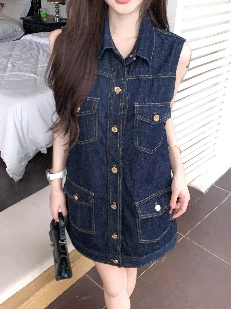 한 부서 레트로 스타일 주머니 디자인 조끼 여성 드레스 여름 2025 새로운 루즈핏 슬림해 보이는 다용도 데님 스커트