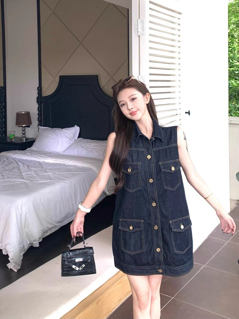 2025 여름 새로운 레트로 디자인 센스 폴로 칼라 민소매 허리 수축 슬림해 보이는 한 마디 롱 스커트 거친 가장자리 데님 여성 드레스