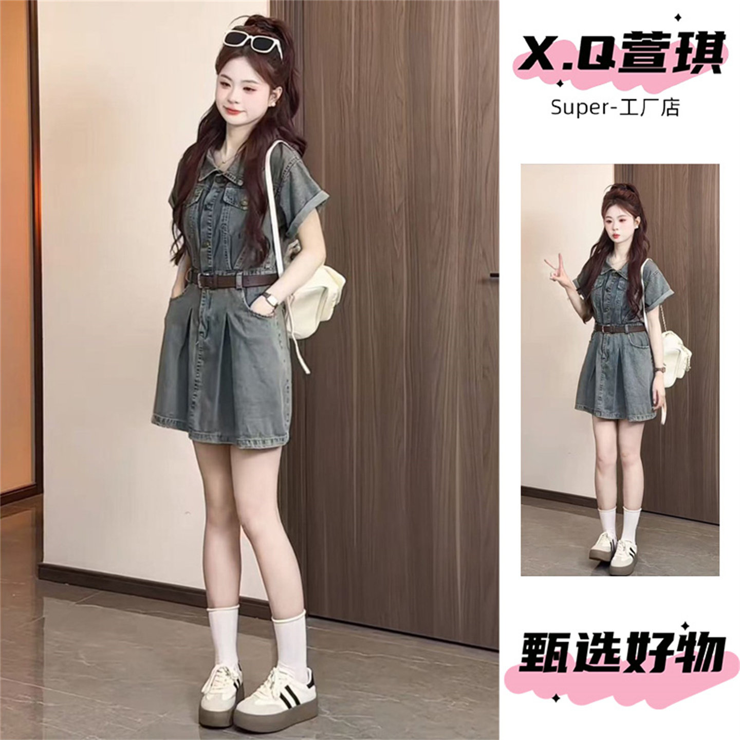 아메리칸 POLO 칼라 반팔 워크웨어 데님 여성 드레스 여름 새로운 고급 센스 패션 허리 수축 슬림해 보이는 미니 스커트