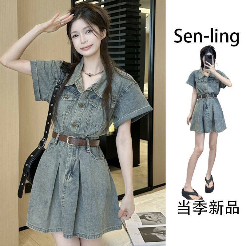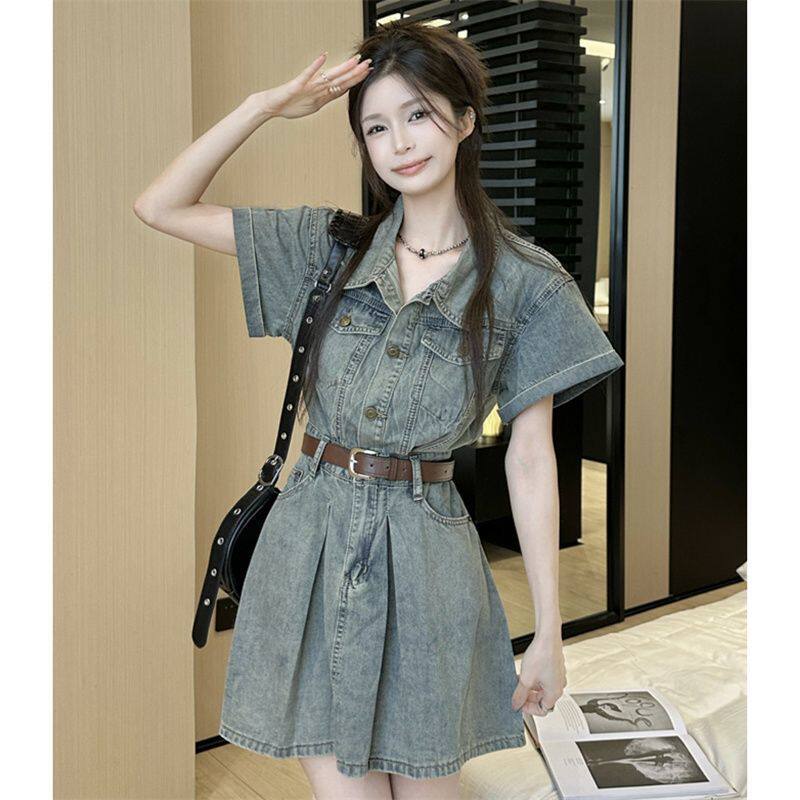 아메리칸 POLO 칼라 반팔 워크웨어 데님 여성 드레스 여름 새로운 고급 센스 패션 허리 수축 슬림해 보이는 미니 스커트