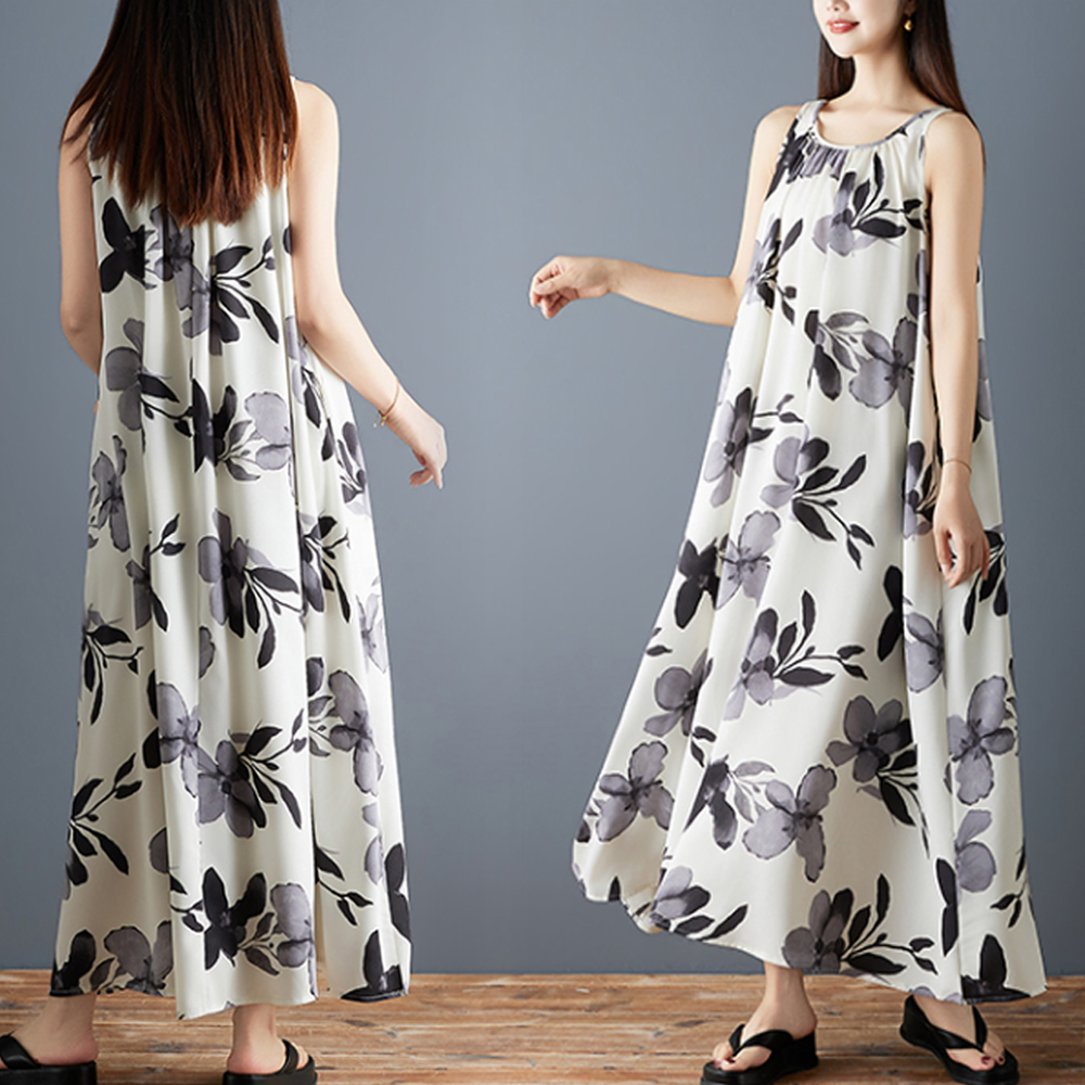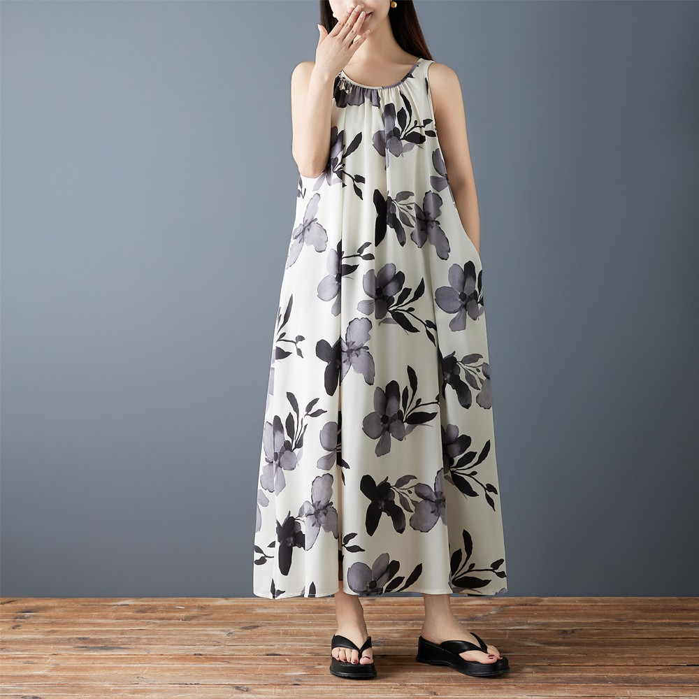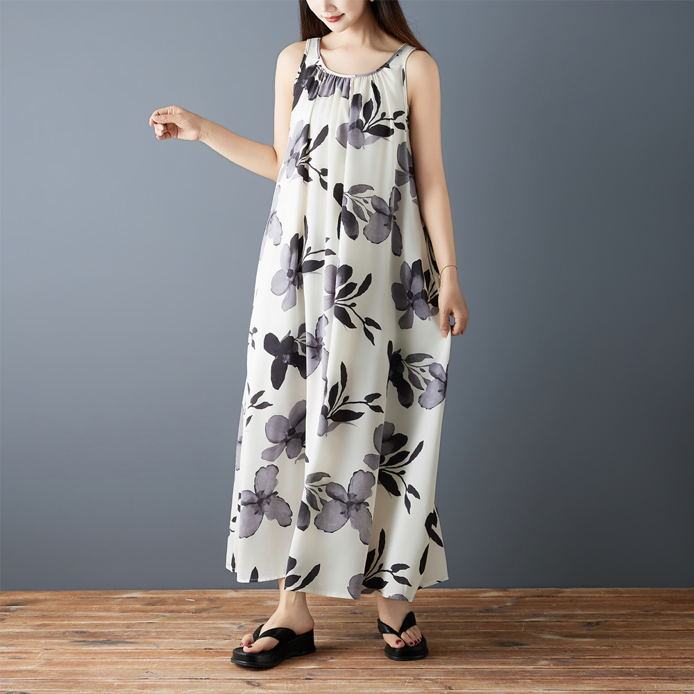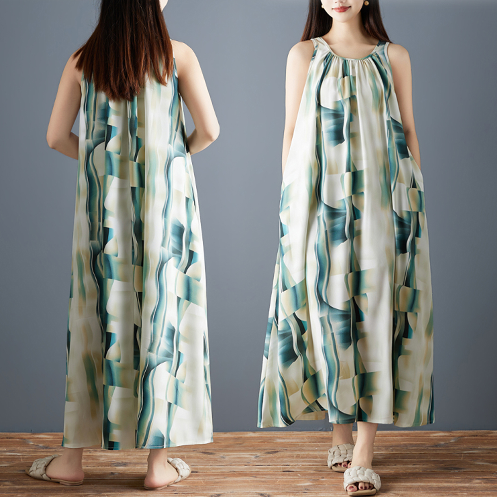 실사 2026 여름 새로운 패션 조끼 롱 스커트 루즈핏 쉬폰 프린트 민소매 레트로 중간 길이 드레스