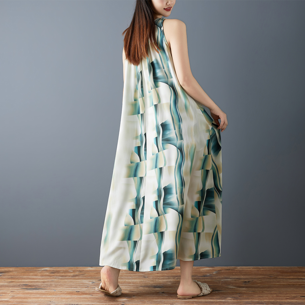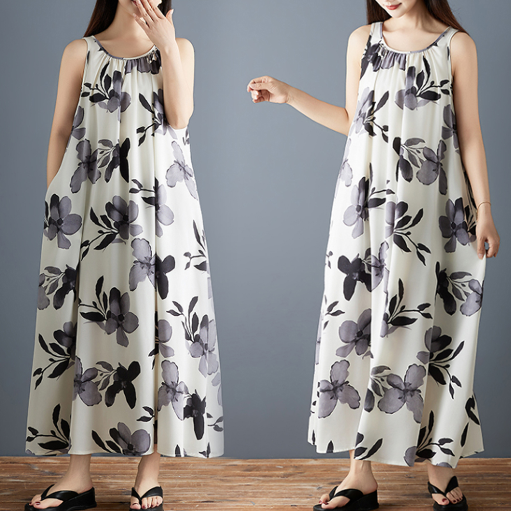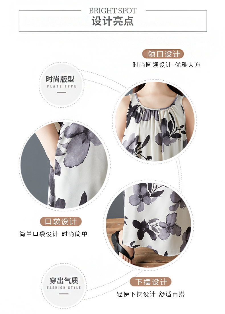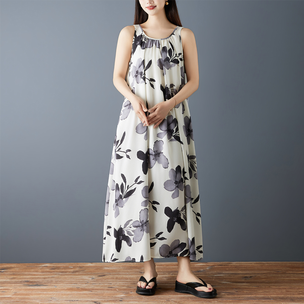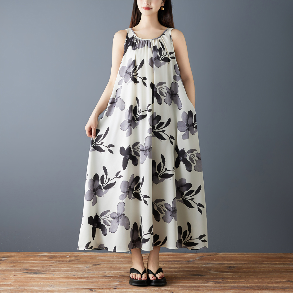 실사 2026 여름 새로운 패션 조끼 롱 스커트 루즈핏 쉬폰 프린트 민소매 레트로 중간 길이 드레스