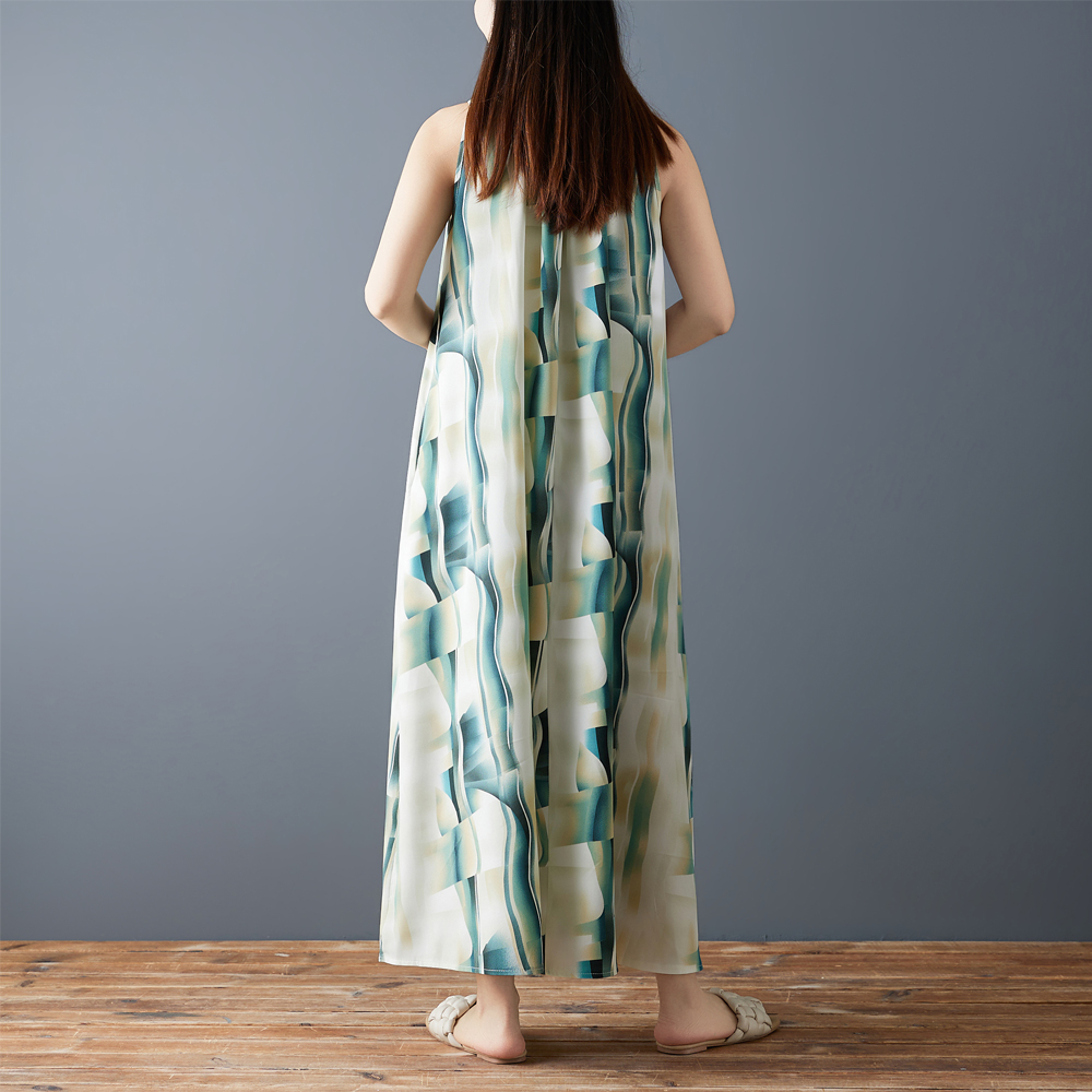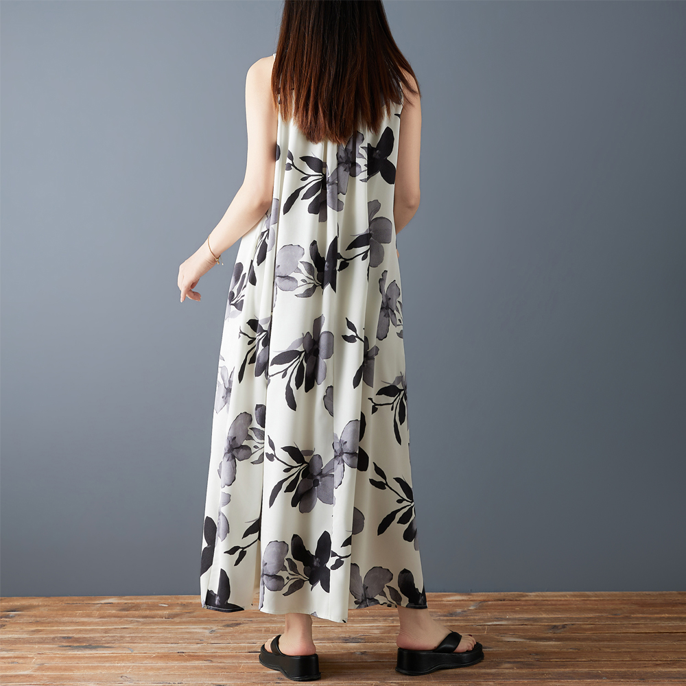 실사 2026 여름 새로운 루즈핏 롱 스커트 쉬폰 수묵화 프린트 디자인 센스 멜빵 중간 길이 드레스