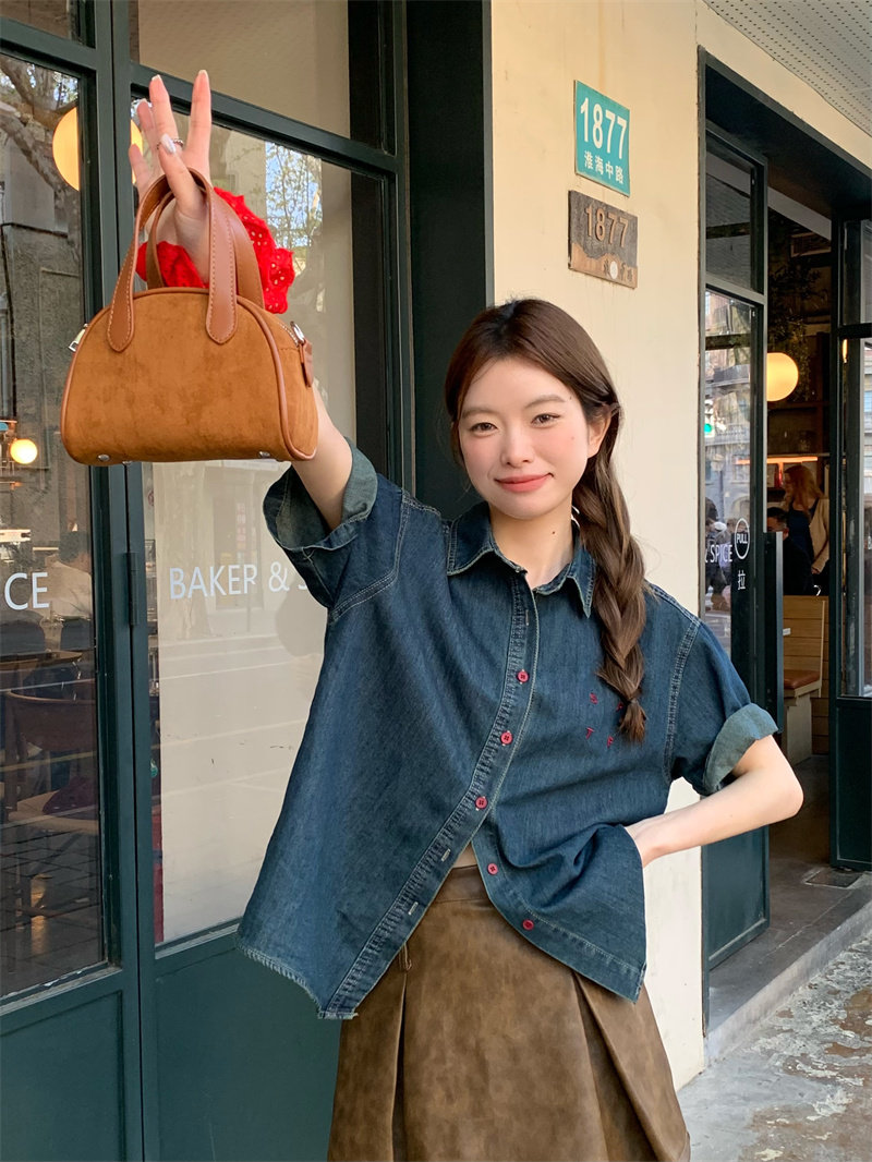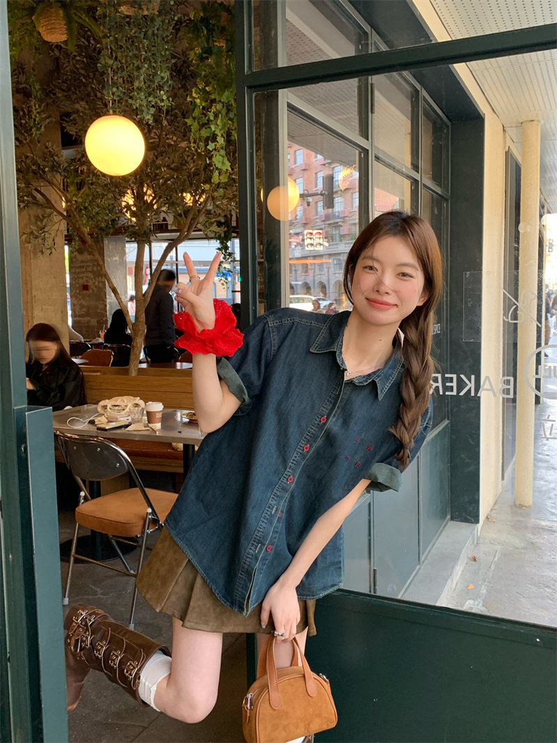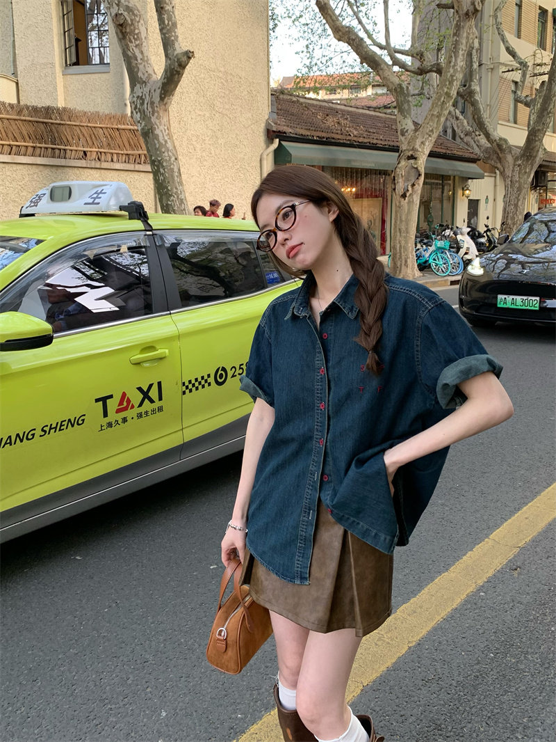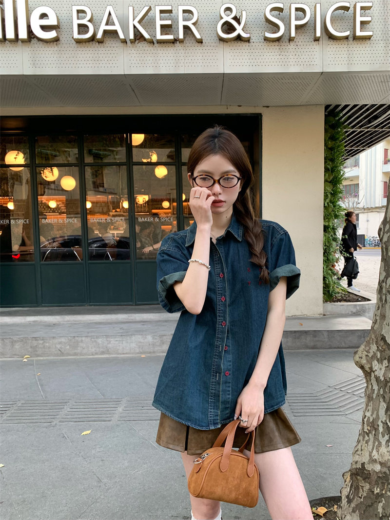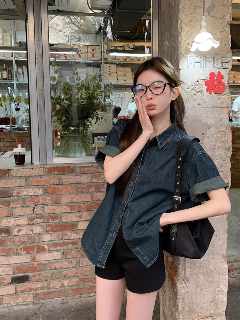 캐주얼 느긋한 반팔 데님 여성 셔츠 여름 셔츠 프랑스식 고급 디자인 센스 자수 루즈핏 품격 맨위