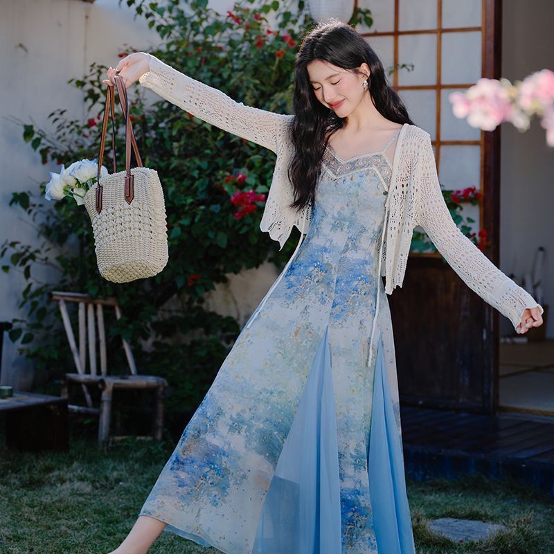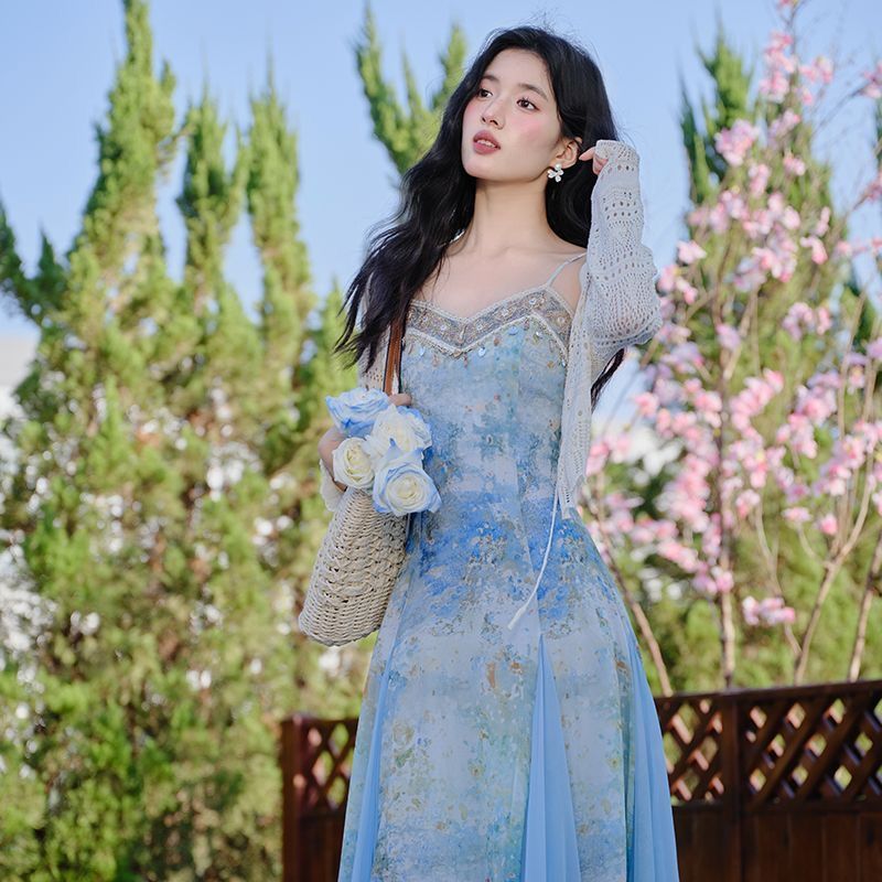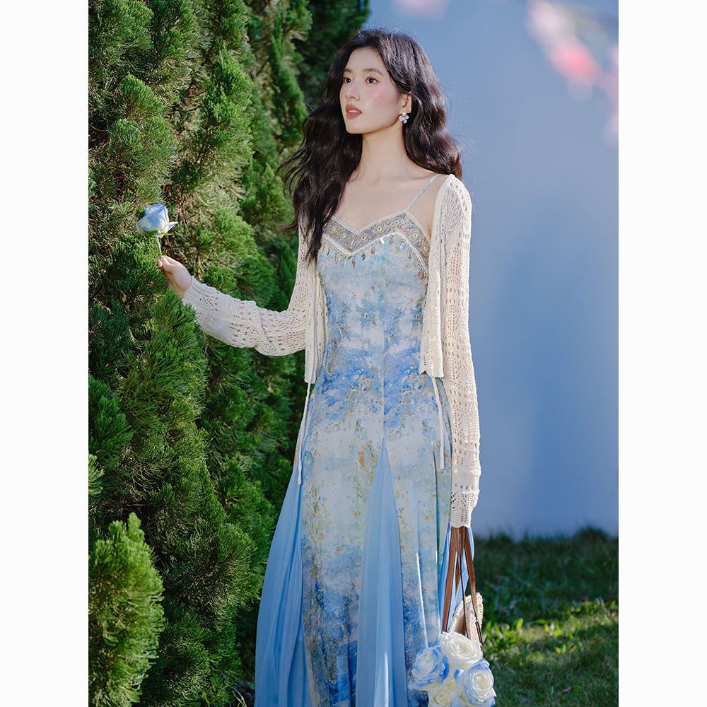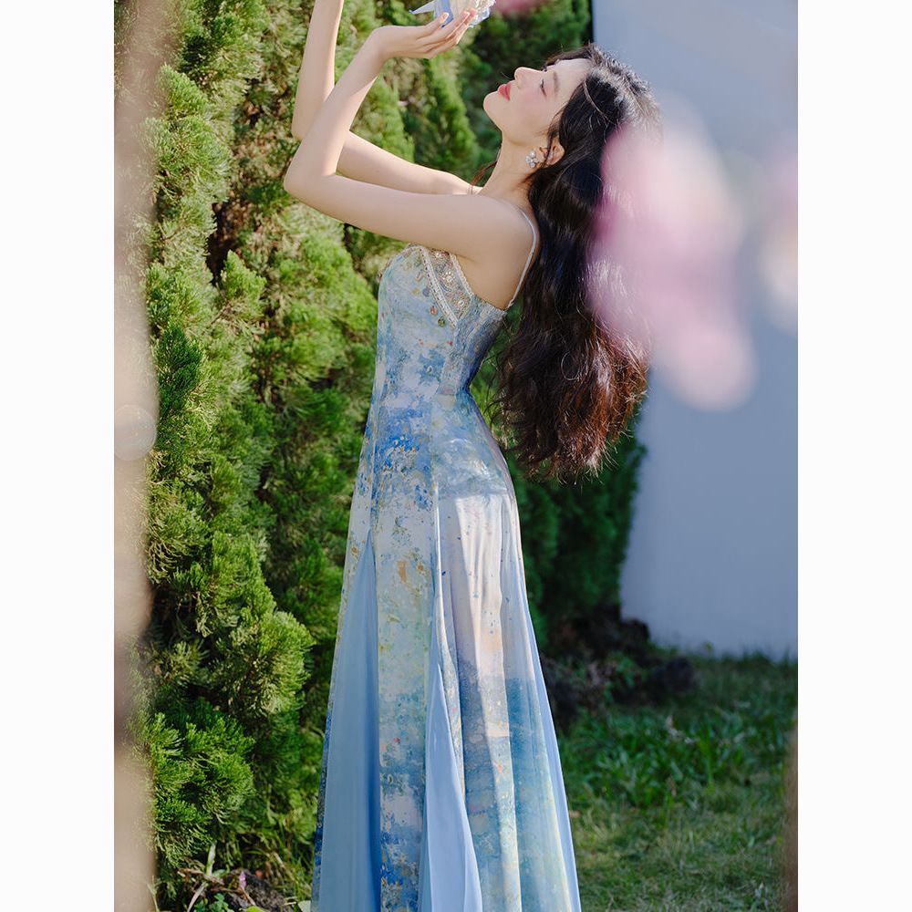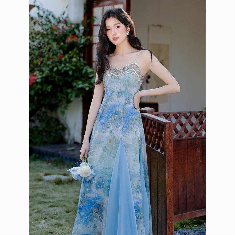 프랑스식 고유 한 아름다운 파란색 잉크 페인팅 슬립 여성 드레스 여름 2026 새로운 해변가 휴가 해변 롱 스커트
