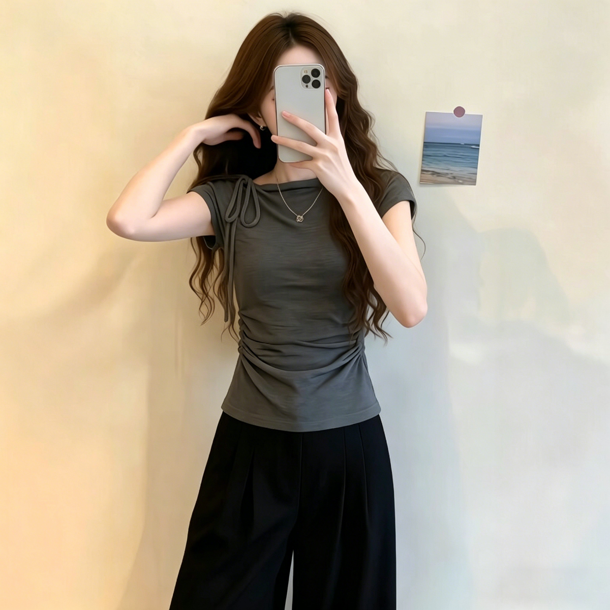 한 부서 긍정적 인 어깨 디자인 센스 반팔 티셔츠 여성 여름 새로운 스트랩 몸매 가꾸기 슬림해 보이는 Chic 맨위