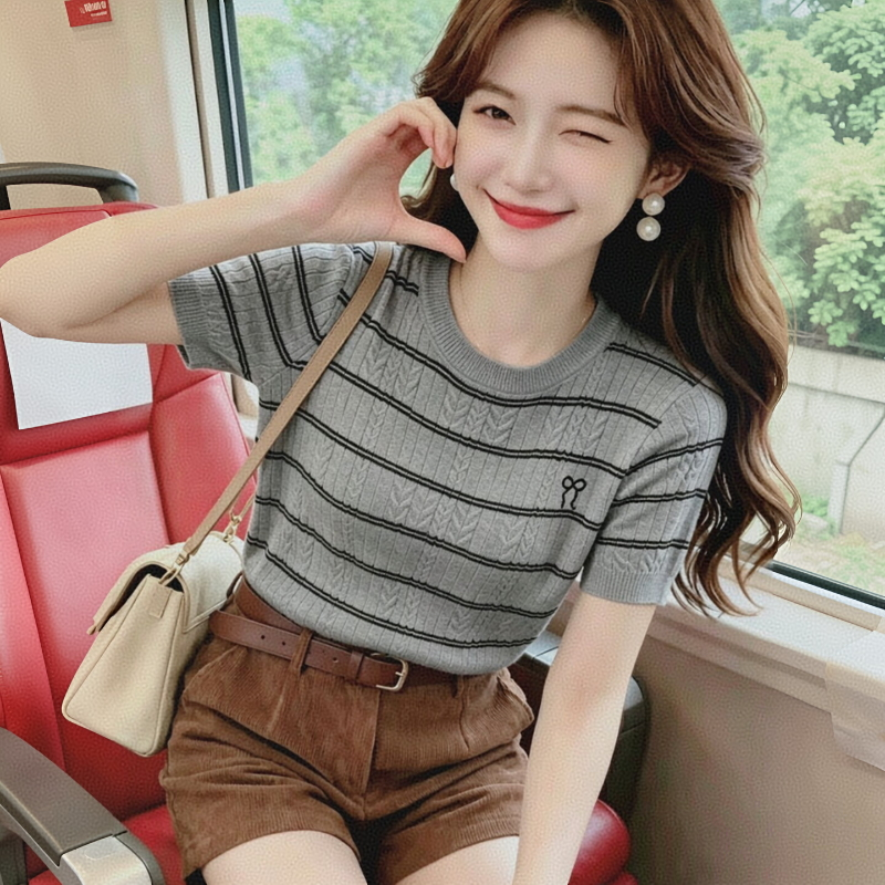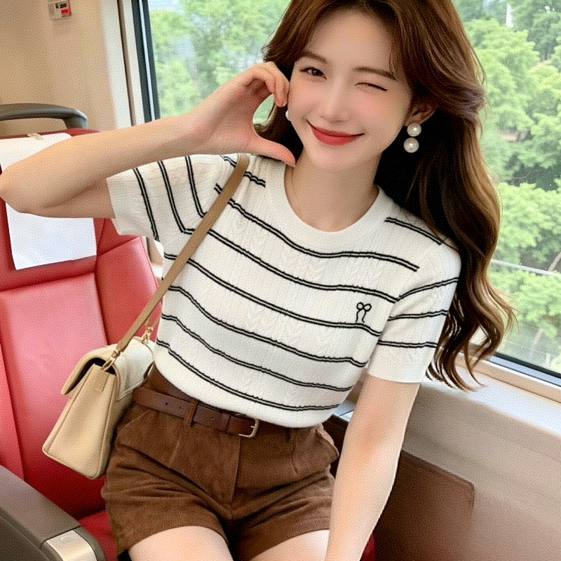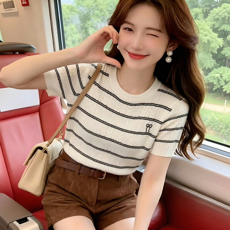 스트라이프 얼음 실크 니트 스웨터 반팔 티셔츠 여성 여름 얇은 쇼트 스타일 긍정적 인 어깨 라운드 넥 부드러운 달콤함 몸매 가꾸기 맨위